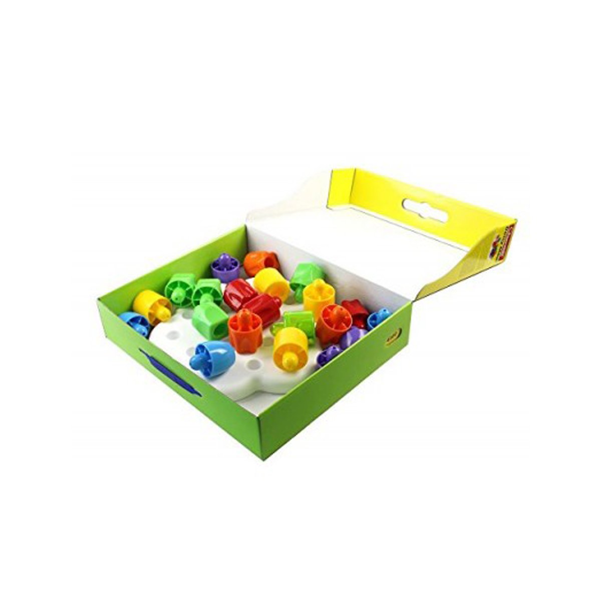 Набір мозаїки Геометрія Максі містить ігрове поле - дошку з отворами і 21 яскраву велику фішку, одна з яких є брязкальцем. Всі елементи набору відмінної якості, кольори - яскраві.