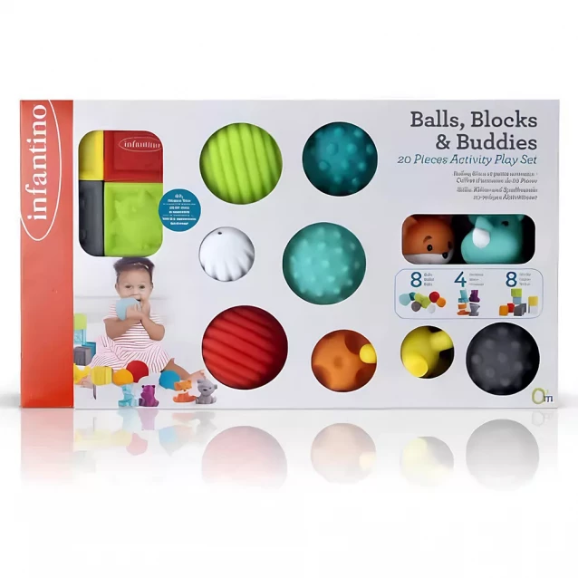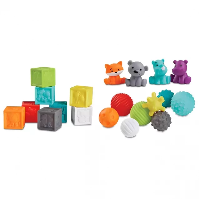 Малюки будуть у захваті від цього великого мульти-сенсорного набору Infantino М'яки, кубики та звірята, які можна стискати.