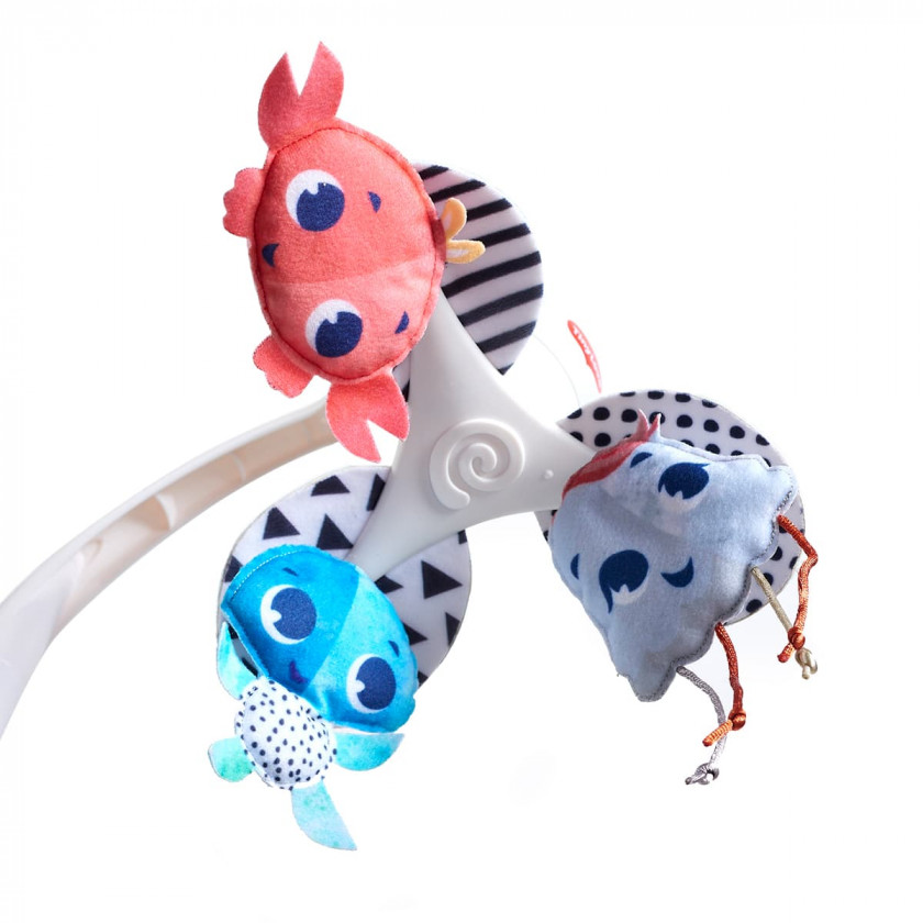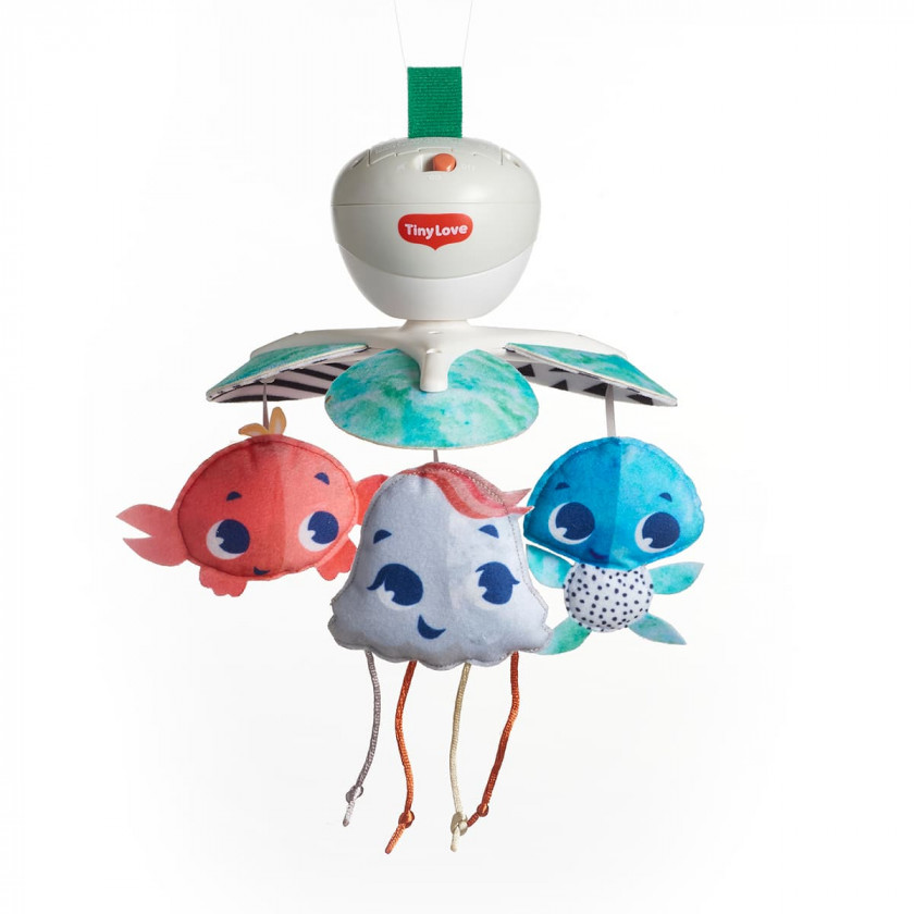 Особливості мультифункціонального мобіля 3 в 1 Tiny Love Океан: комплектація: мобайл, 3 підвісні іграшки: краб, черепашка, медуза; 3 елементи кріплення: дуга, липучка та крабик; іграшки розташовані під кутом, обличчям до дитини; універсальне кріплення дуги підійде майже до будь-якого ліжечка; 30 хвилин безперервної роботи; програє 5 ніжних заспокійливих мелодій.