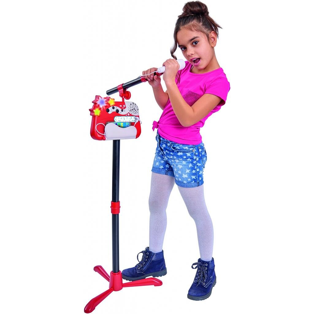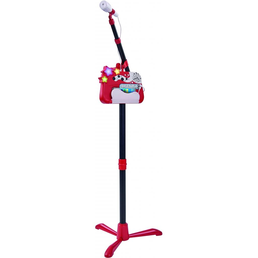 Характеристика: Мікрофон із музичною панеллю на стійці, 4 демомелодії, Роз'єм для МP3, Мікрофон і музична панель від'єднується, Стійка регулюється за зростом.