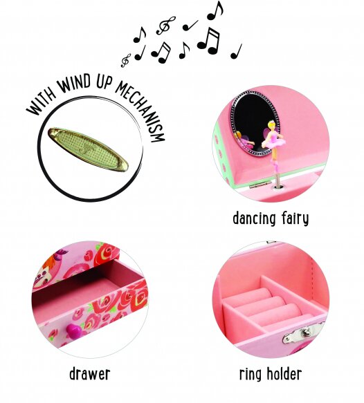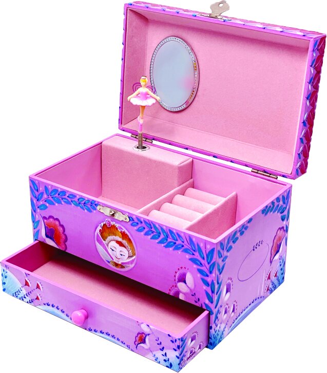 Музична скринька для прикрас стане чудовим подарунком для дівчинки. Заведіть механізм, відкрийте кришку та дозвольте музиці перенести вас у дивовижний казковий світ! Ця скринька для коштовностей являє собою барвисту коробку з балериною, що обертається, дзеркалом, тримачем для каблучок, відсіком для прикрас і висувною шухлядкою.