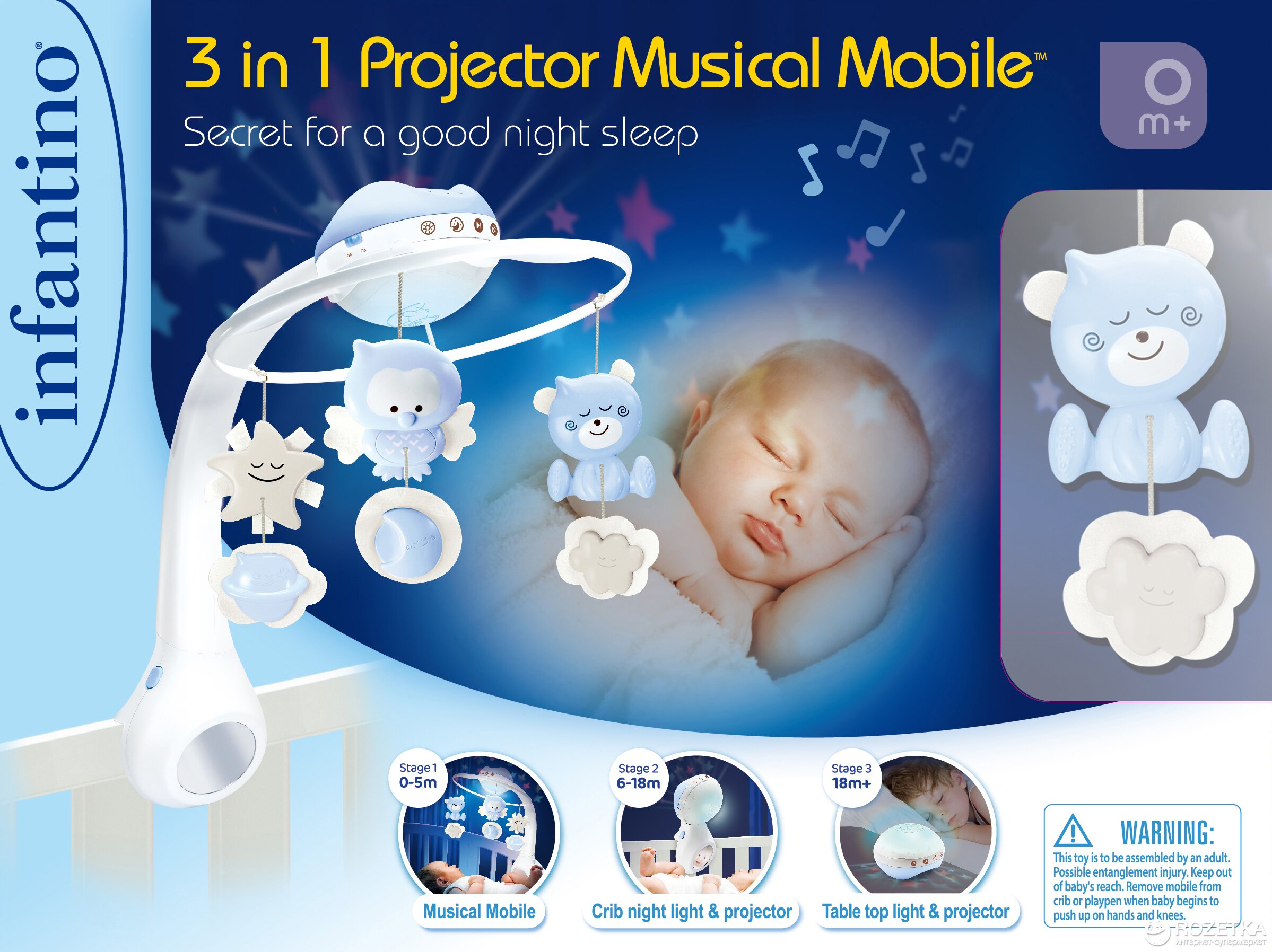 Музичний мобіль із проектором 3 в 1 від відомого бренду Infantino - це дуже якісний і багатофункціональний мобіль, який батьки зможуть використовувати з народження малюка та до 3 і більше років, адже він перетворюється в симпатичний нічник. Мобіль виготовлено з дуже якісних матеріалів. Стильні кольори та іграшки-підвіски будуть розважати малюка — Ведмедик, Зірочка та мудре Совеня. Кріпиться на ліжечко малюка.