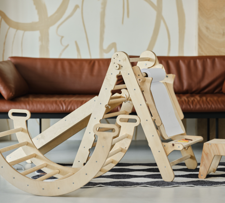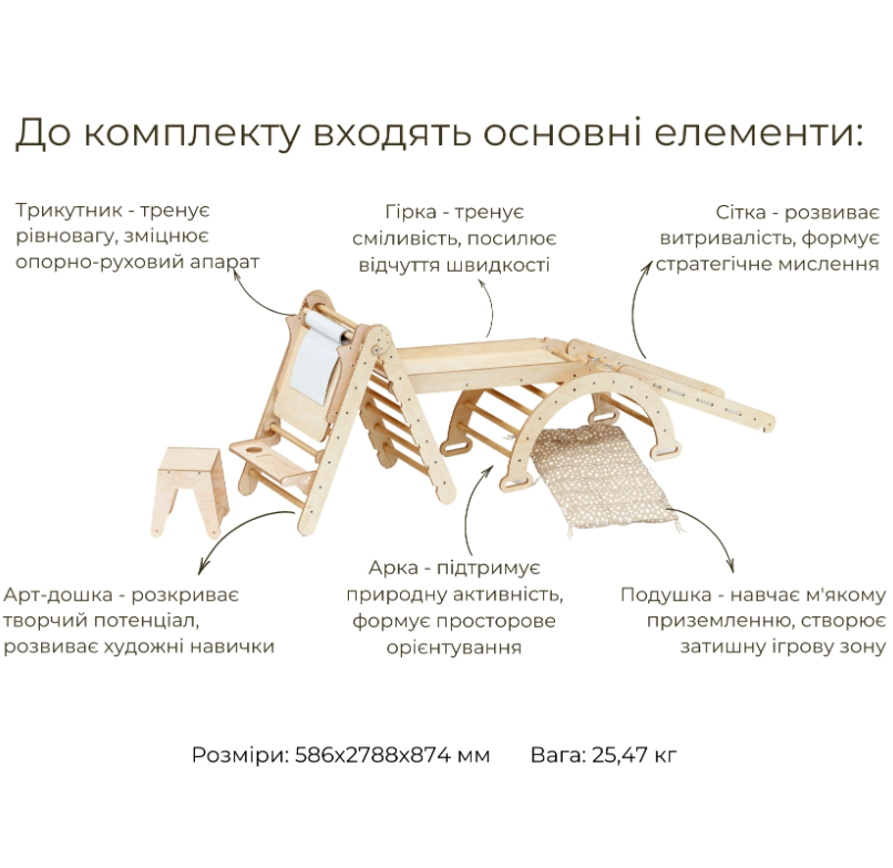 Трикутна драбина служить одночасно як тренувальний інструмент для початківців і як захоплююча іграшка. Завдяки просторій корисній поверхні, вона чудово підходить для енергійних дітей і може легко вмістити двох малюків, що граються одночасно.
