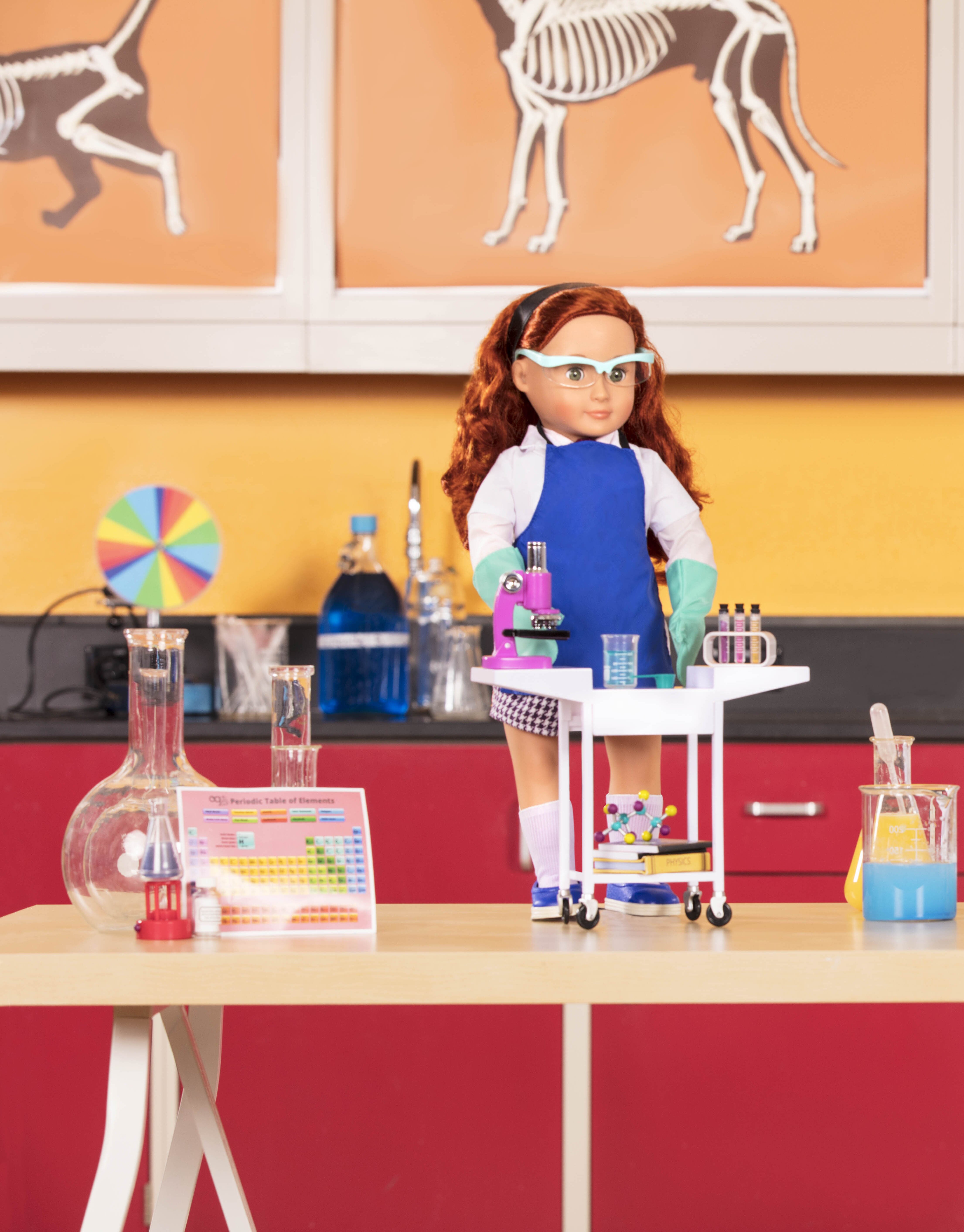 Допоможіть улюбленим лялькам зробити своє наступне велике відкриття за допомогою «Наукового набору для школи»! У цьому лабораторному наборі наукового класу є всі необхідні STEM-аксесуари для ляльок, які обов’язково викликають у них уяву. Комплектування: 24 предмети. Зокрема фартух, захисні рукавички для ляльок, різноманітні пробірки та склянки, пальник Бузена, мікроскоп, та навіть модель скелета. Занотуйте в блокнот усі свої відкриття разом із Our Generation. Рекомендований вік 3+.