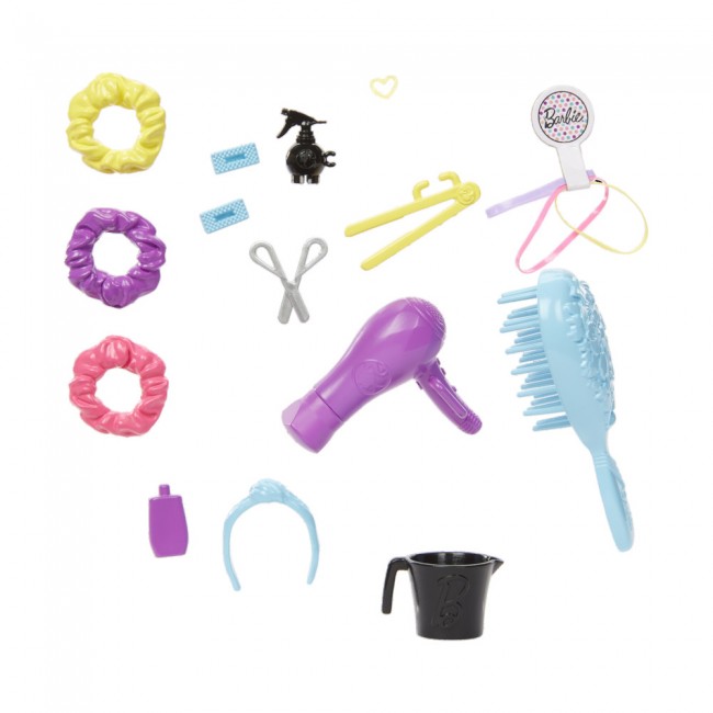 За допомогою інших аксесуарів дівчинка створюватиме ляльці стильні зачіски, а потім розчеше волосся й знову втілюватиме в життя нову неймовірно модну ідею! Вигадувати можна безліч зачісок, для цього є дві заколки, три скранчі, одна пов’язка на голову й один набір резинок. Також серед аксесуарів гребінець, ножиці, пляшечка шампуню, пульверизатор, відро та щипці для волосся.