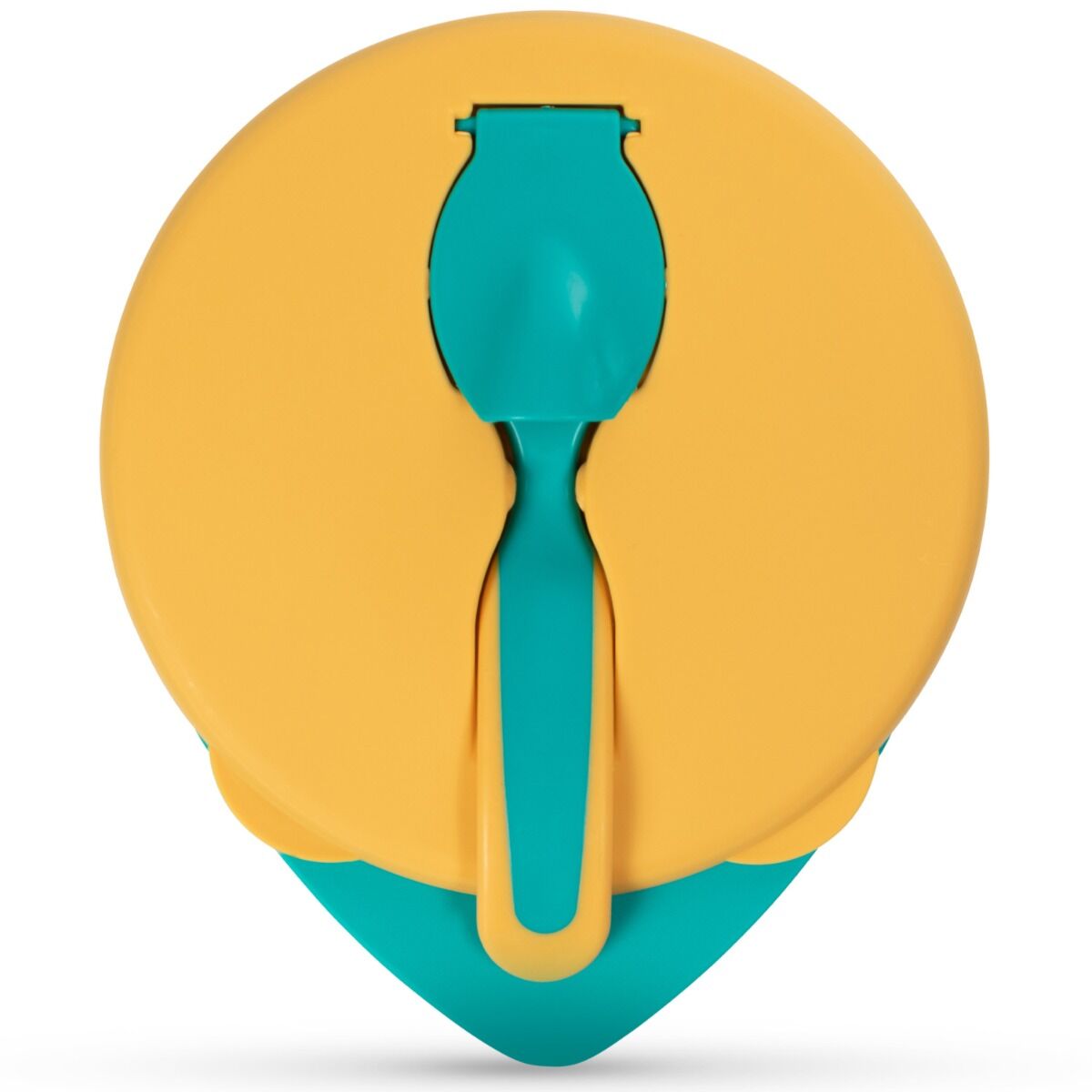 Набір посуду для першого підгодовування малюкам від 6 місяців. Включає глибоку тарілку, кришку та ложку. Виготовлений з ударостійкого пластику без бісфенолу А. Можна мити в посудомийній машинці, ставити в НВЧ піч для розігріву їжі. Набір зручно брати у дорогу. Завдяки кришці, що щільно прилягає, тарілка абсолютно герметична. Ложка кріпиться до виїмки із замочком на кришці.