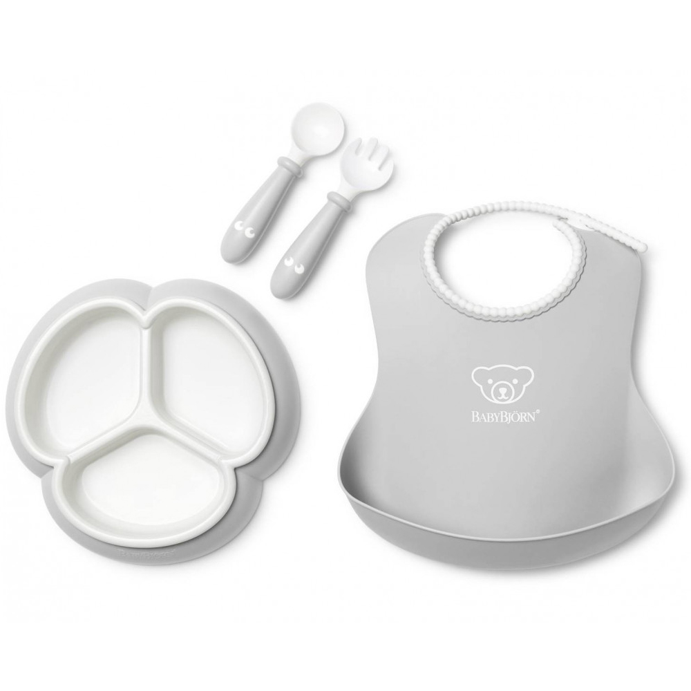 Набір дитячого посуду BabyBjorn із продуманими деталями, розроблений спеціально для найменших малюків. Міцна тарілка у формі конюшини, столові прилади зі зручними ручками, полегшать самостійне харчування та принесуть масу радості вашій дитині. М'який слинявчик має глибоку кишеню, куди поміщається все, що не потрапляє в рот. Набір BABYBJÖRN представлений у милих пастельних кольорах.
