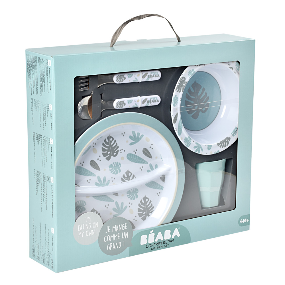Набір дитячого меламінового посуду Beaba складається з миски для перших блюд, 2-секційної тарілки, склянки, ложки, виделки.