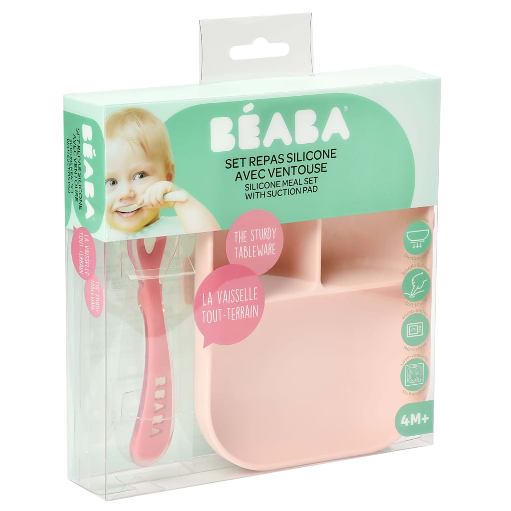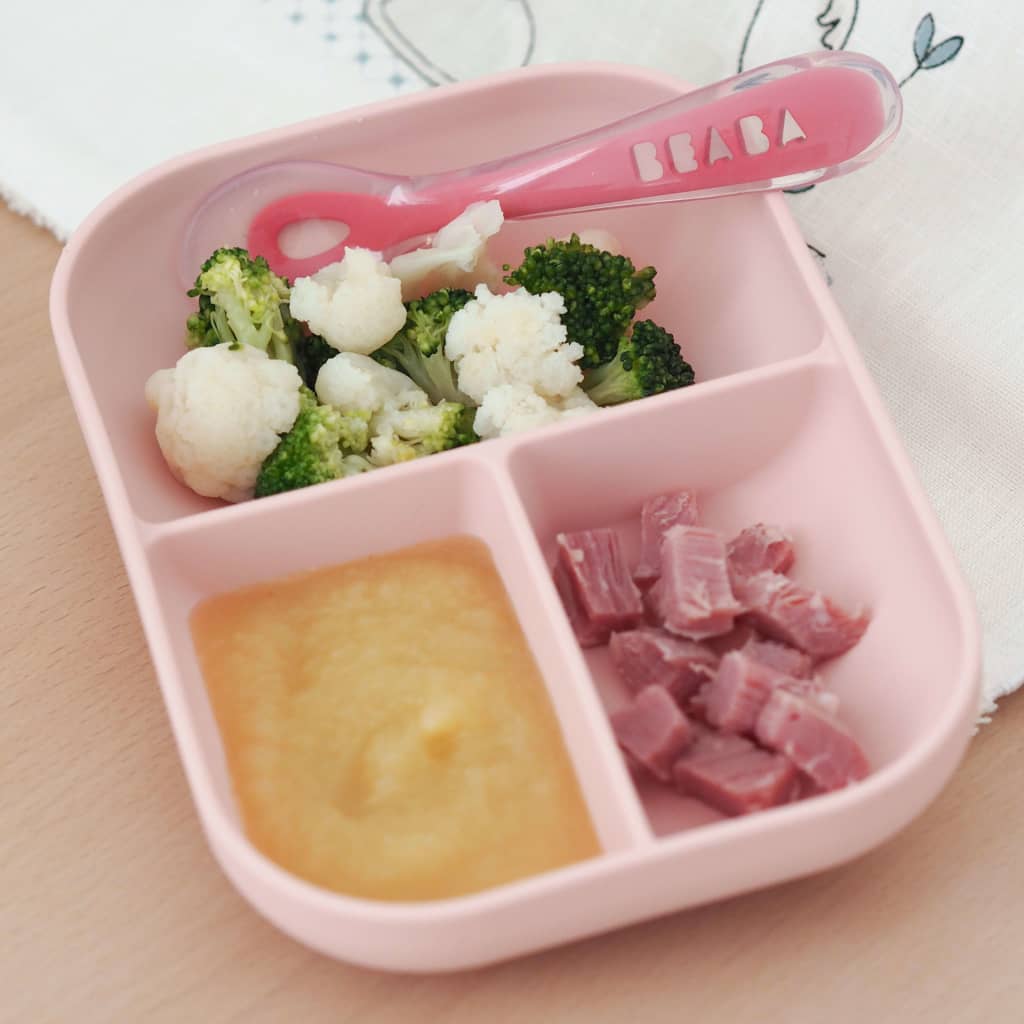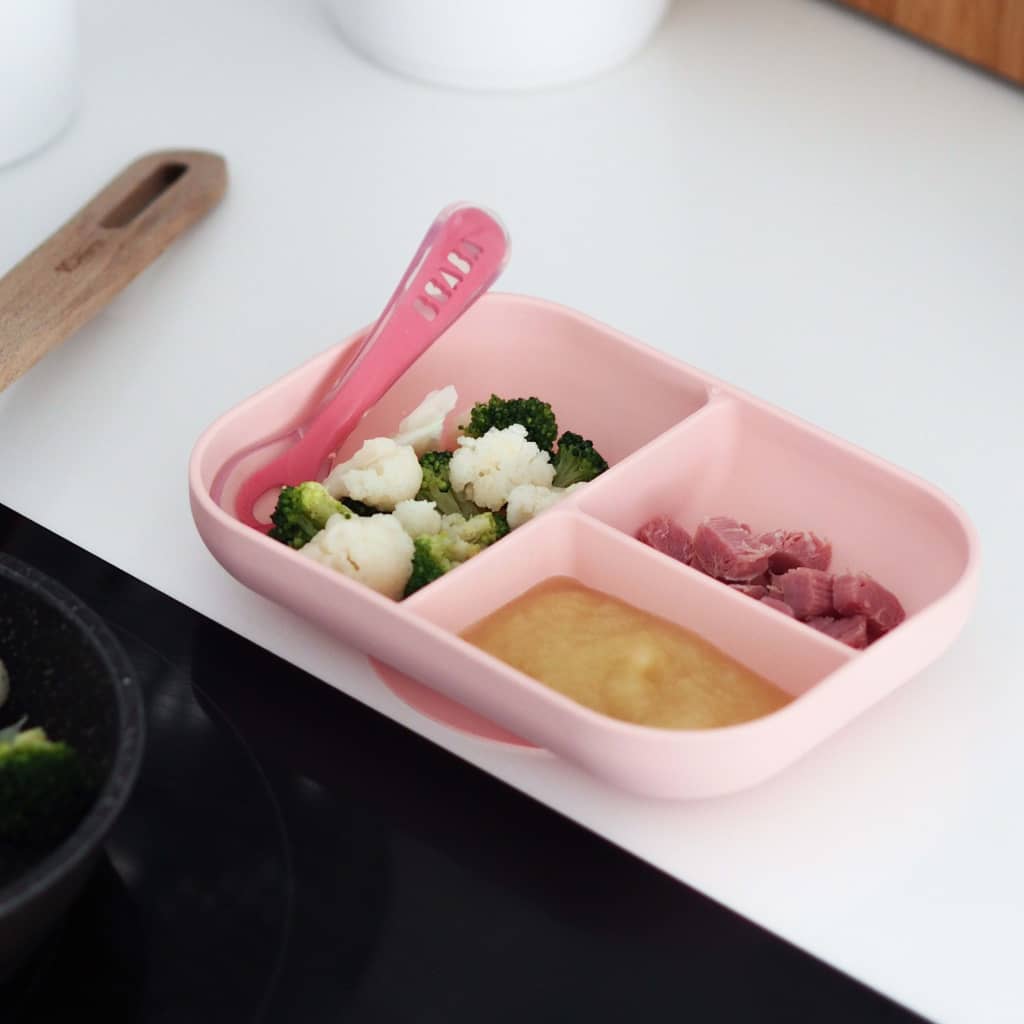 Рожева тарілка Beaba з присоскою та відділеннями створена навчити дитину їсти охайно.