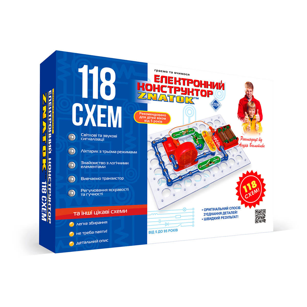 Електронний конструктор Znatok (118 схем) - чудовий подарунок дитині 5 років, яка хоче відчути себе юним інженером! Конструктор дозволяє дитині своїми руками створювати світлові і звукові сигналізації, ліхтарик з трьома режимами, допоможе в знайомстві з логічними елементами, вивченні транзистора, регулюванні яскравості і гучності. Завдяки оригінальному способу з'єднання деталей Ви зможете домогтися швидкого і ефективного результату без використання паяння.