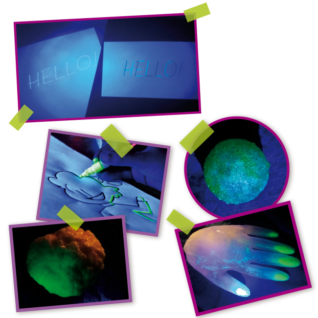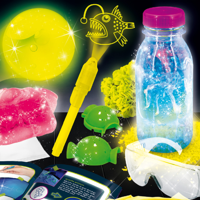 У наборі є все необхідне для безпечного проведення перших наукових експериментів у темряві: чорнило, діаманти, фосфоресцентні слизи, люмінесцентні рослини, надувні кульки, що світяться в темряві та... багато іншого!