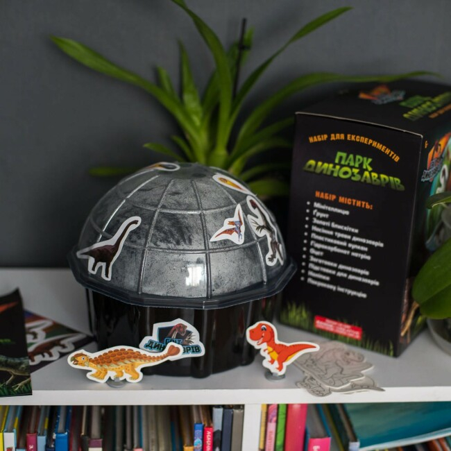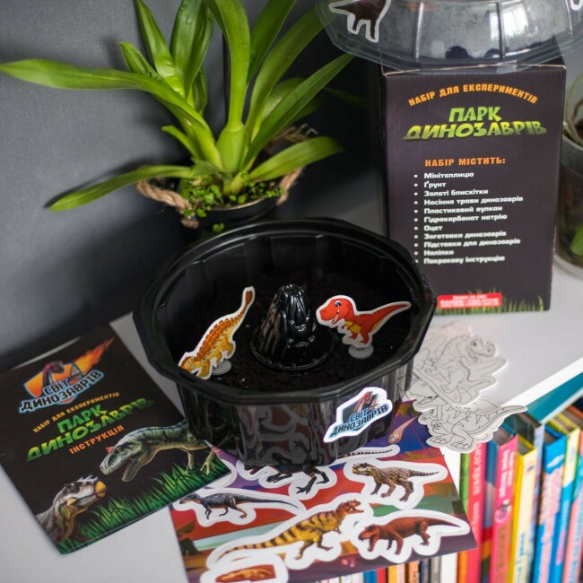 Зі складових набору створюйте власний неймовірний мініпарк динозаврів. Садіть траву для диво-тварин та спостерігайте, як вона зростає. Додайте трішечки творчості — розфарбуйте динозаврів та помістіть їх у мінітеплицю. А ще створіть дивовижні спец.ефекти — відтворивши діючий вулкан тріасового періоду, який імітує потік лави!