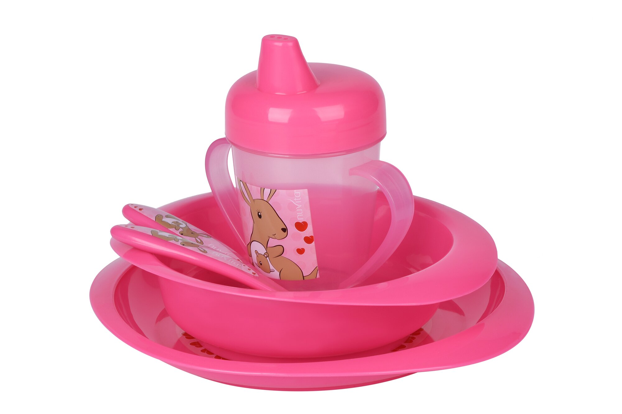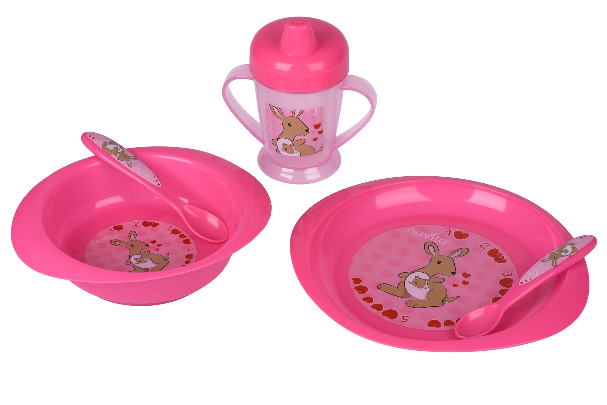 Рожевий набір із 5-ти предметів для дитячого харчування від італійського бренду Nuvita.