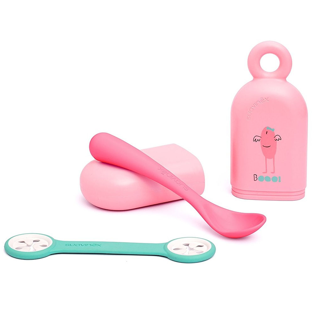 Цей багатофункціональний набір для годування містить кліпсу для нагрудників, ложку і футляр.