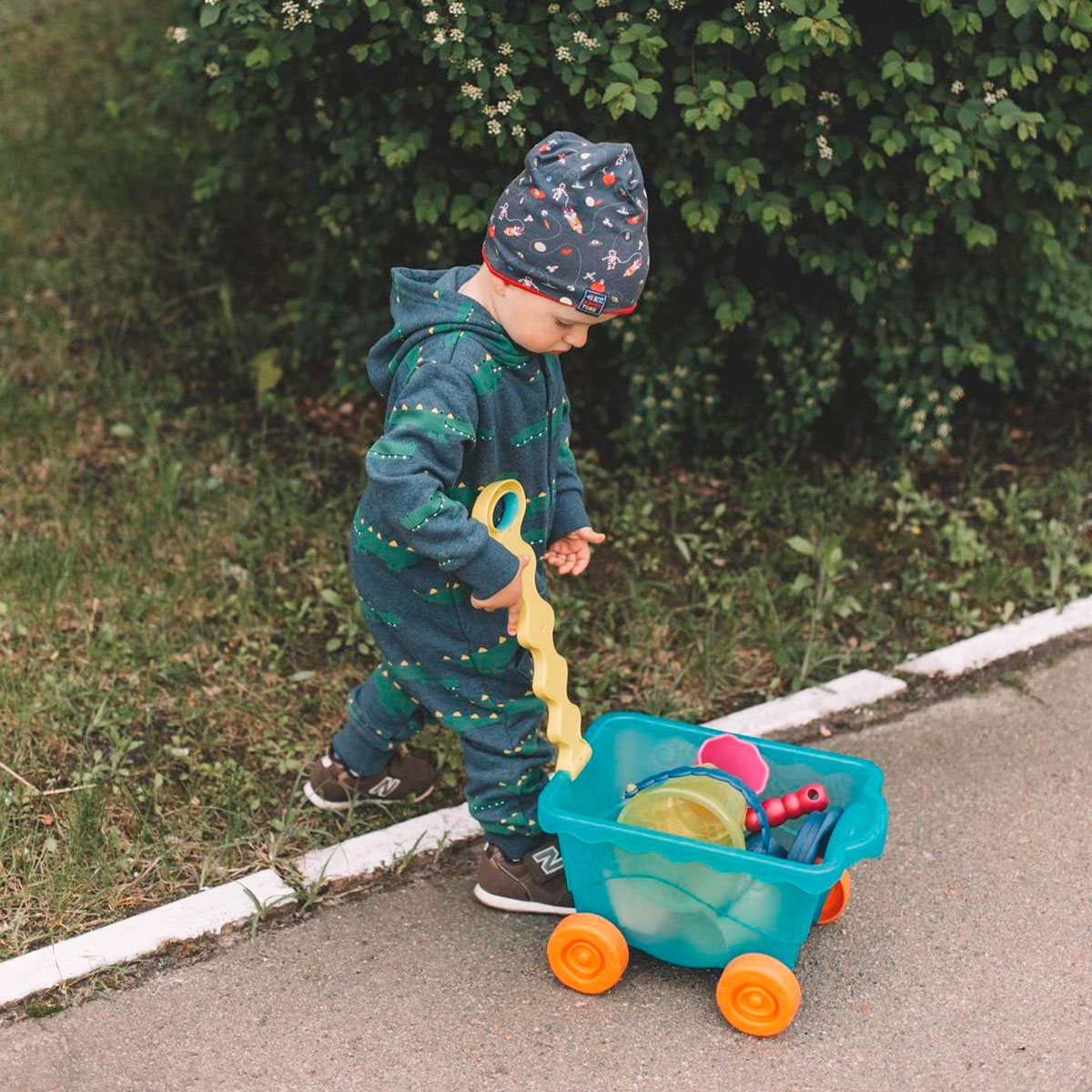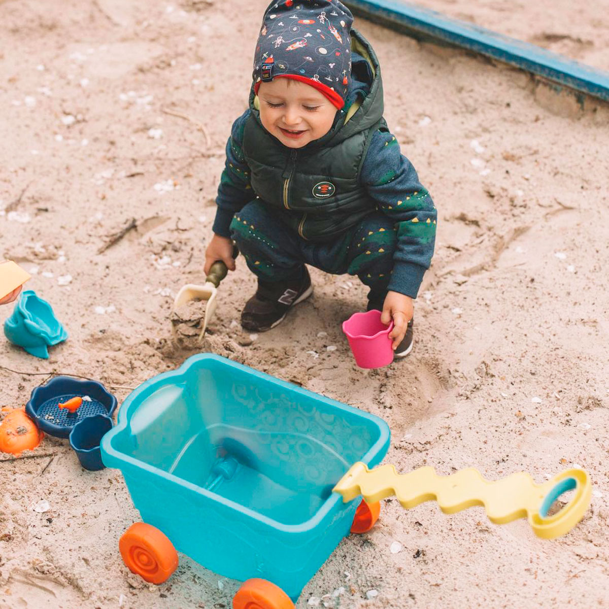 Комплектація: Візок — 1 шт., Велике ведерце — 1 шт., Сито для піску — 1 шт., Лопатка — 1 шт., Граблі — 1 шт., Кораблик — 1 шт., Пасочка-рибка — 1 шт., Маленькі відерця з отворами — 3 шт., Кришка у формі акули — 1 шт.