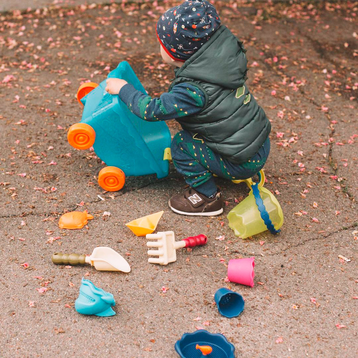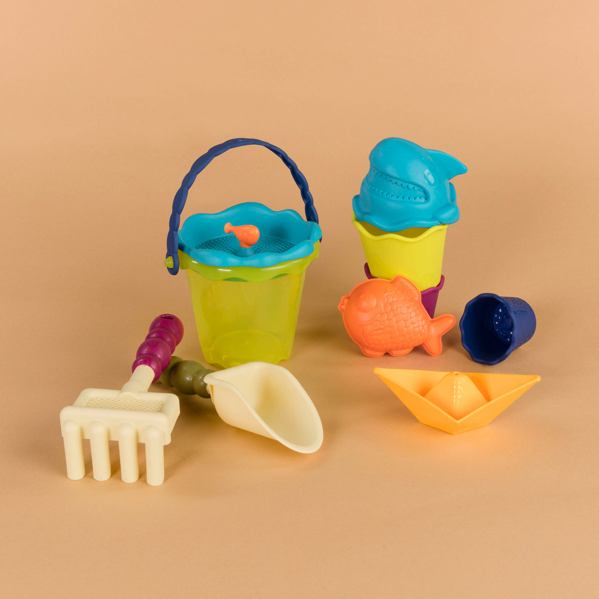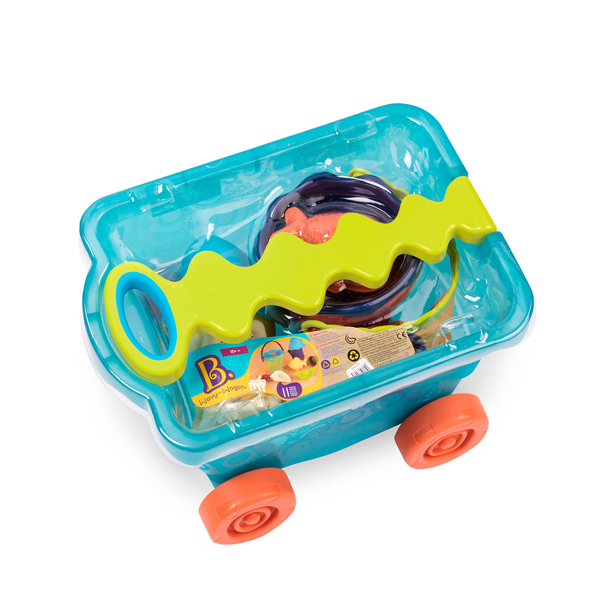 Творчі, розумні, чарівні іграшки Battat створені з великою любов'ю для чудових і щасливих малюків. Інноваційне мислення, унікальний дизайн і тверді принципи дають змогу компанії Battat вже понад сто років підкорять серця дітей і їхніх батьків. Симпатичний Battat Візок Море з химерною ручкою містить корисні аксесуари для гри в пісочниці та на пляжі: велике відерце із ситом для піску, лопатку, граблі, кораблик, пасочку-рибку, а також 3 маленькі відерця з отворами, які можна вкладати одне в одного, ставити одне на одного у формі вежі та закривати кришкою у формі акули.