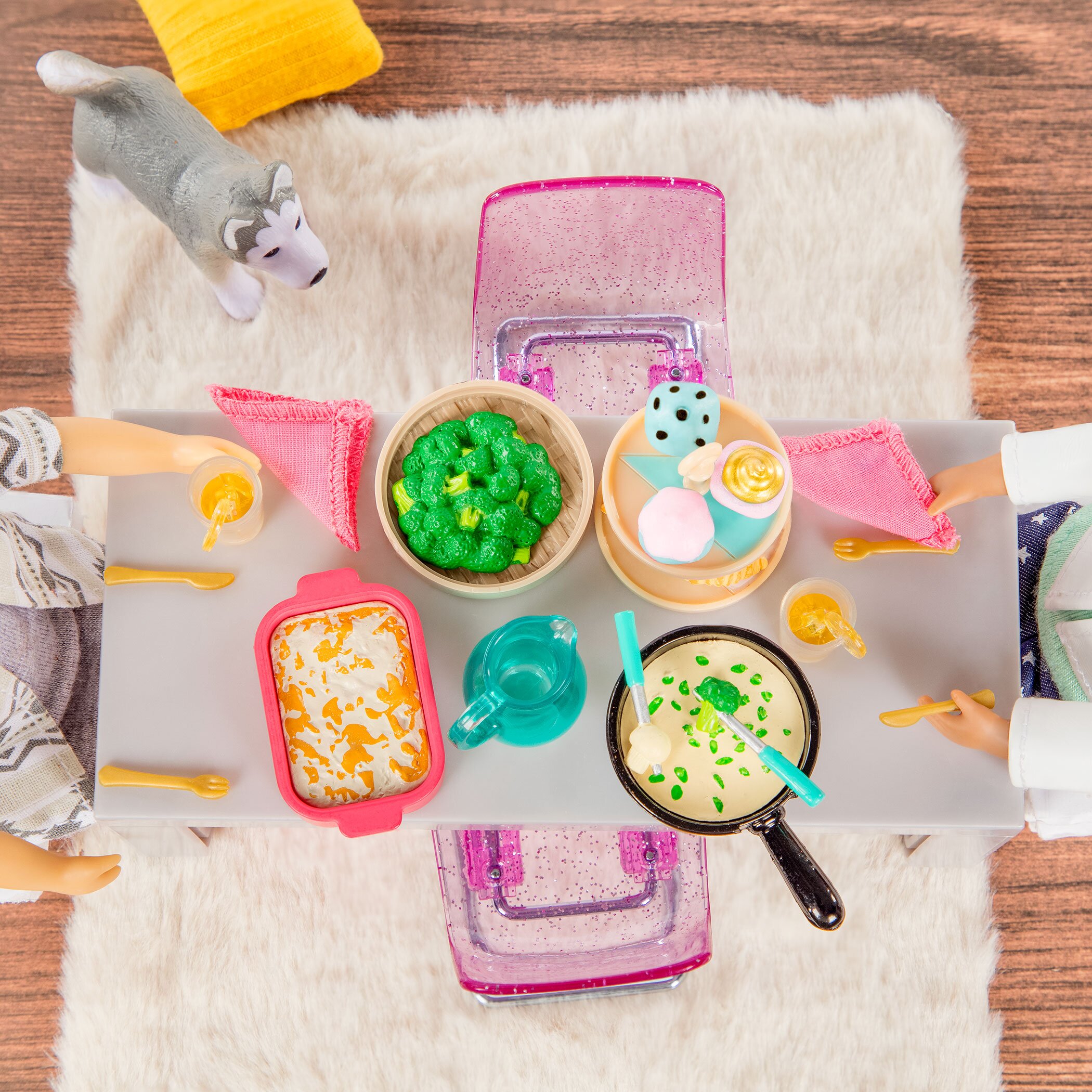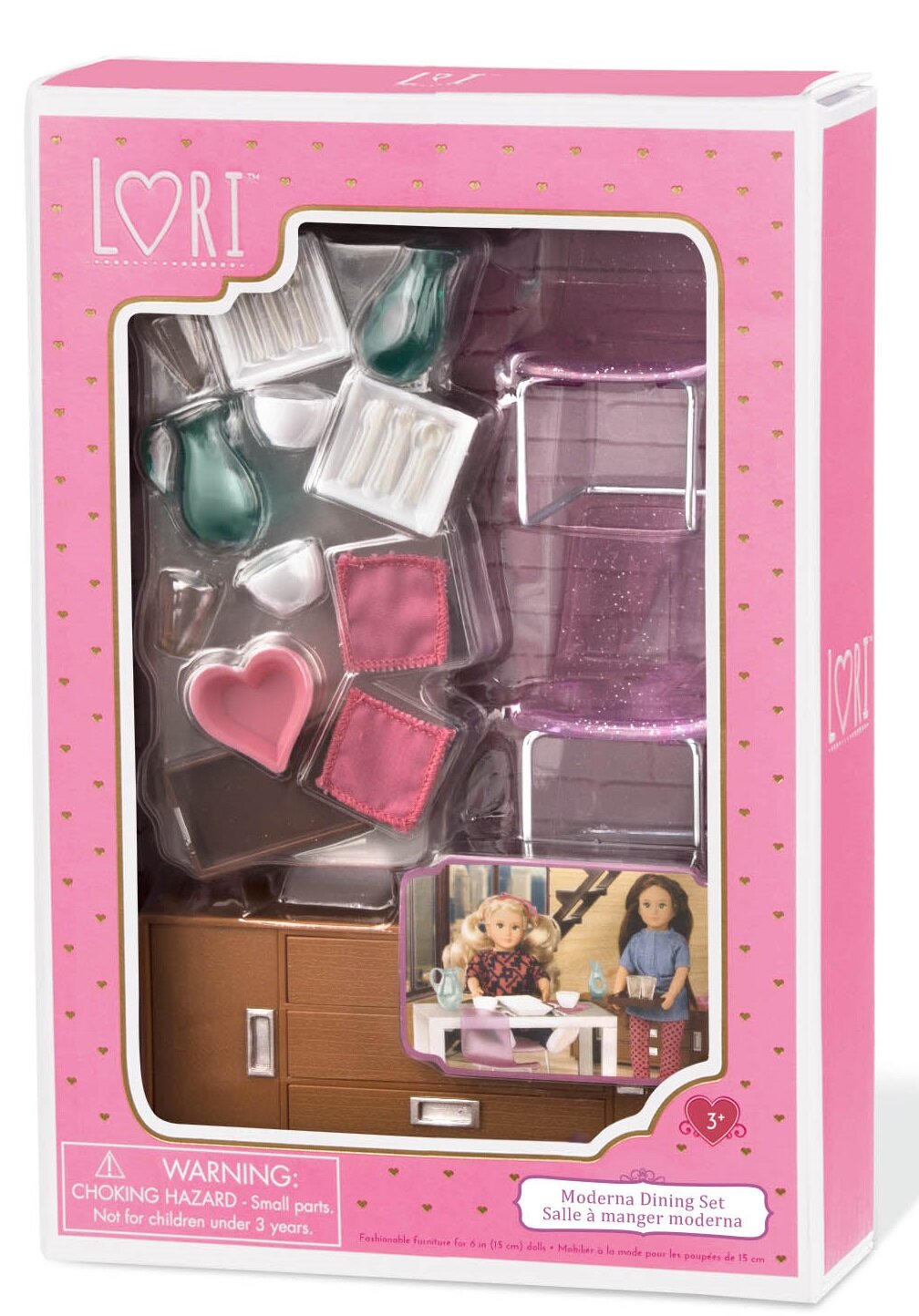 Їдальня – не лише місце прийому їжі, а й атмосферних посиденьок з друзями і теплих розмов з рідними. Сучасний набір меблів для їдальні стане цікавим доповненням до іграшок LORI. Всі предмети прекрасно деталізовані і функціональні: елегантний обідній стіл зі стільцями, буфет з висувними ящиками і дверима, що відкриваються, столовий сервіз з аксесуарами. Все для створення комфорту в будинку: від посуду і столових приборів до серветок! Підходить для усіх ляльок 15 см LORI. Усі елементи набору виготовлені із якісної пластмаси, та є абсолютно безпечними для малюків.