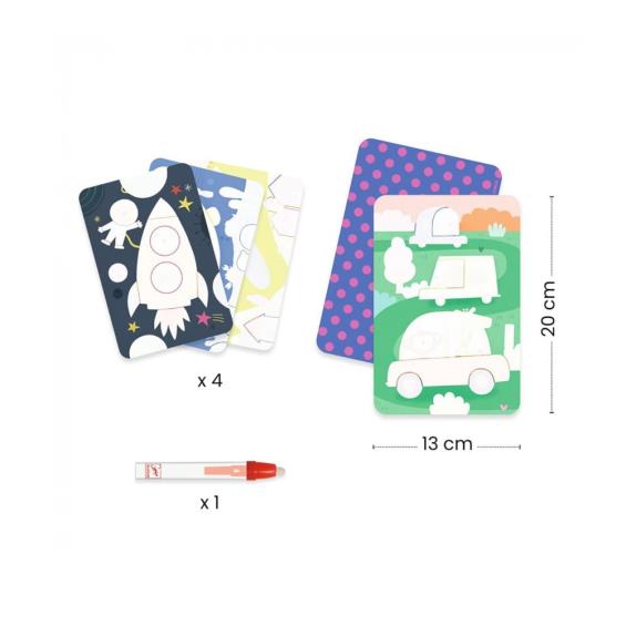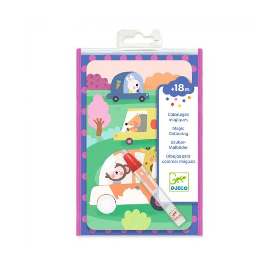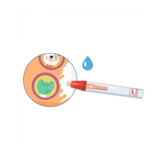 Художній комплект для малювання водою, спеціально розроблений для малюків віком від 18 місяців. Діти використовують заповнений водою олівець, щоб розфарбувати білі ділянки і побачити, що ж ховається під ними. Це магія: з'являються картинки! Як тільки сторінки висохнуть, веселощі починаються спочатку!