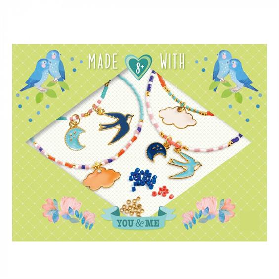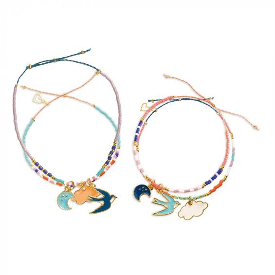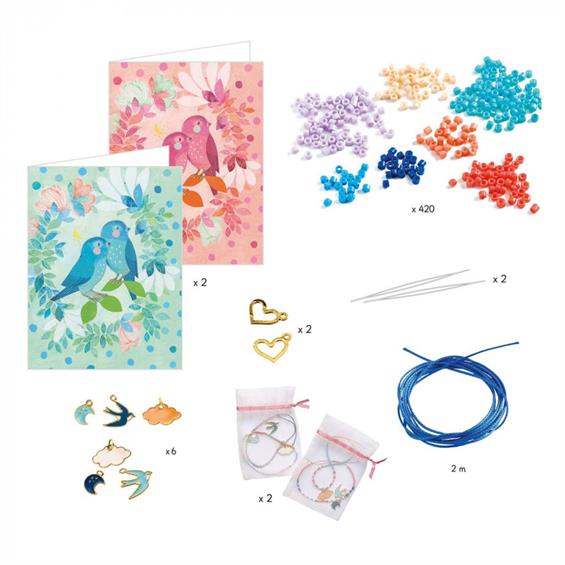 Набір для виготовлення браслетів DJECO Птахи подарує незабутні емоції. Блискуча коробочка містить підібраний набір намистин та підвісок, з яких можна створити два суперські браслети дружби.