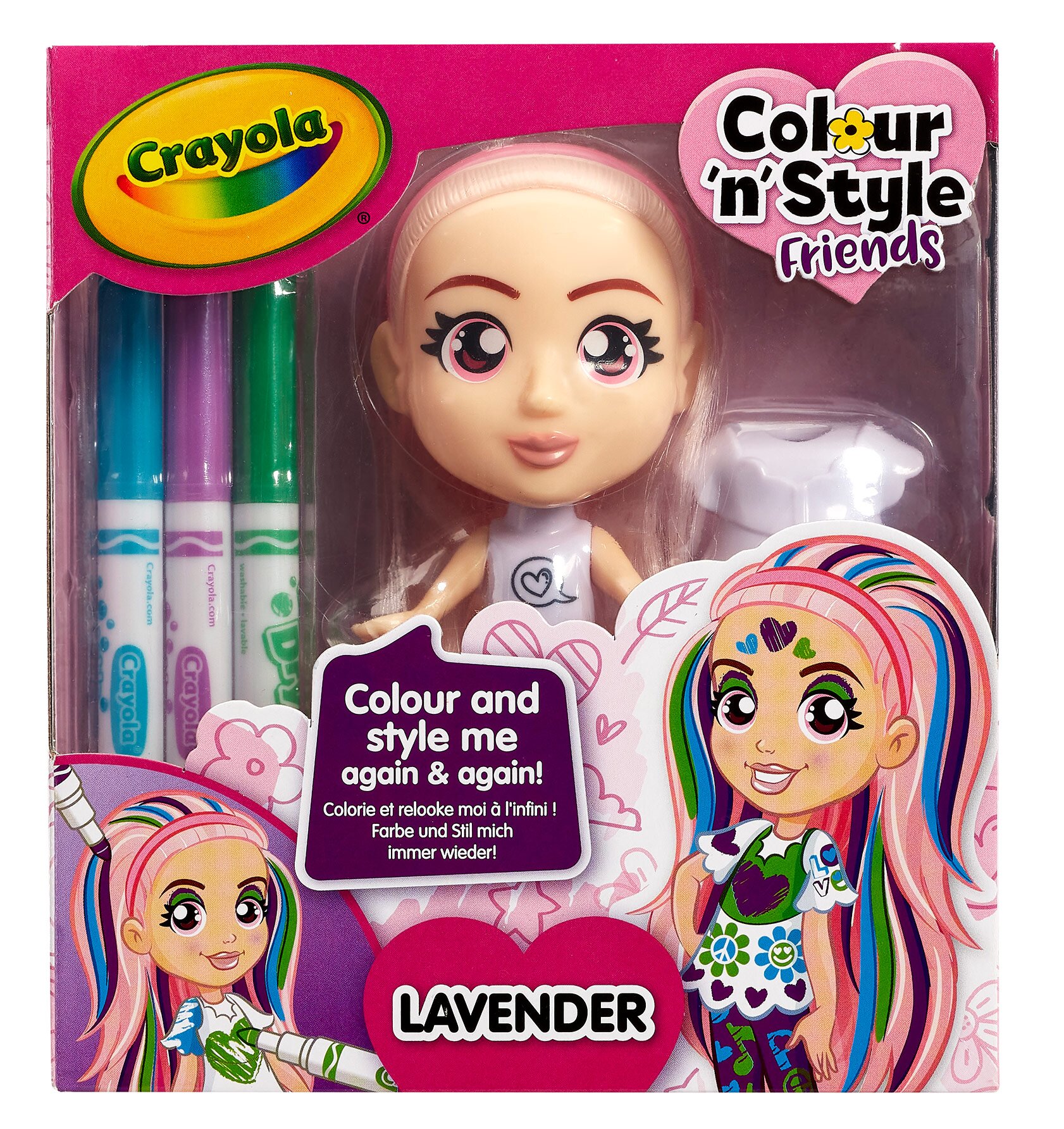 Набір для творчості Crayola Colour n Style Лаванда — подаруйте цій ляльці чудовий макіяж та модний лук! Щоб зробити їй крутий наряд спочатку пристебніть одяг, що входить до комплекту, потім персоналізуйте його за допомогою фломастерів намалюйте веселі візерунки та дизайни.
