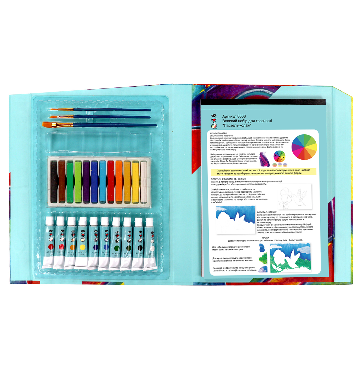 Набір в твердій обкладинці містить: гід по технікам малювання українською мовою; 10 тюбиків з акриловими фарбами (12 мл); 12 шт. воскової крейди; 3 пензлика різних розмірів; палітра; 25 спеціальних аркушів для малювання (формат А4).
