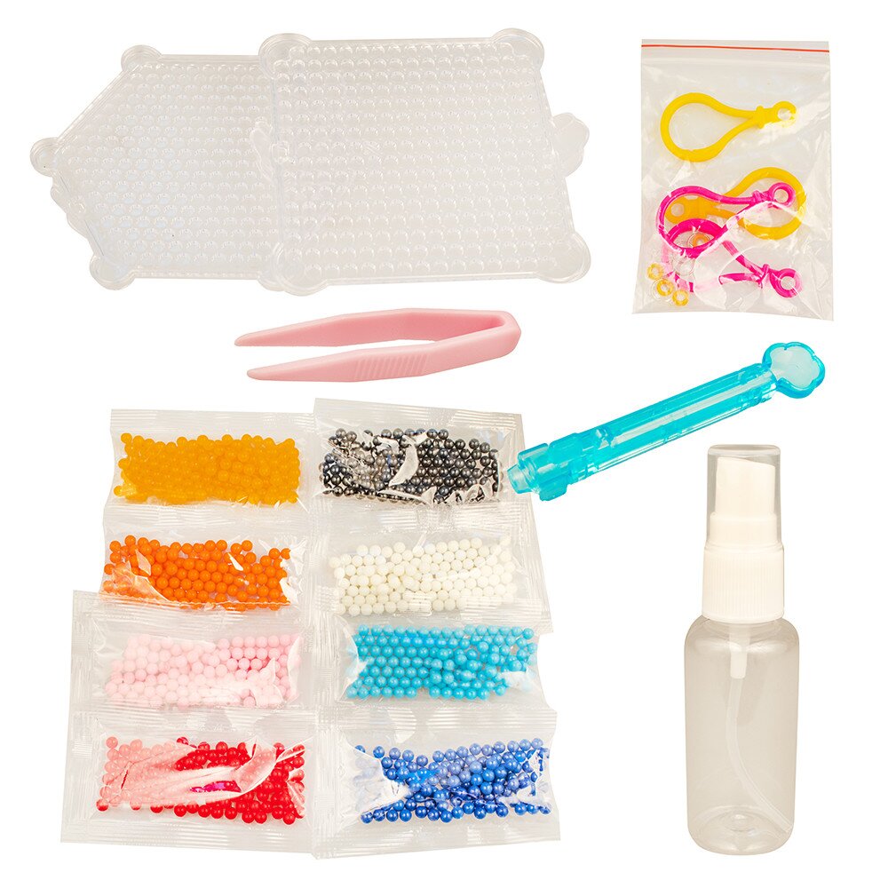 У набір входять спеціальні намистинки, які скріплюються між собою за допомогою води. Досить продумати малюнок, який хочеться отримати в результаті, скласти його з намистин на трафареті, поприскати водою з пульверизатора і залишити для фіксації на 30 хвилин або більше. Після того або доповнити отриману пласку фігурку намистинками для додання обсягу, або додати до виробу петельки, щоб вийшов повноцінний брелок!