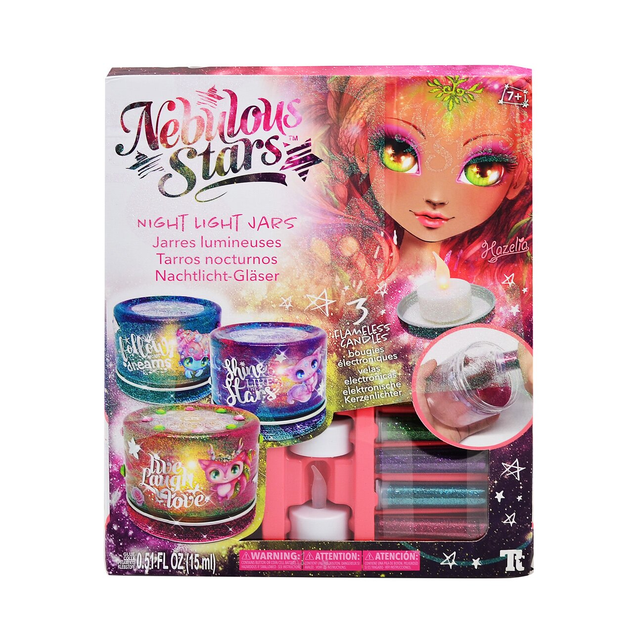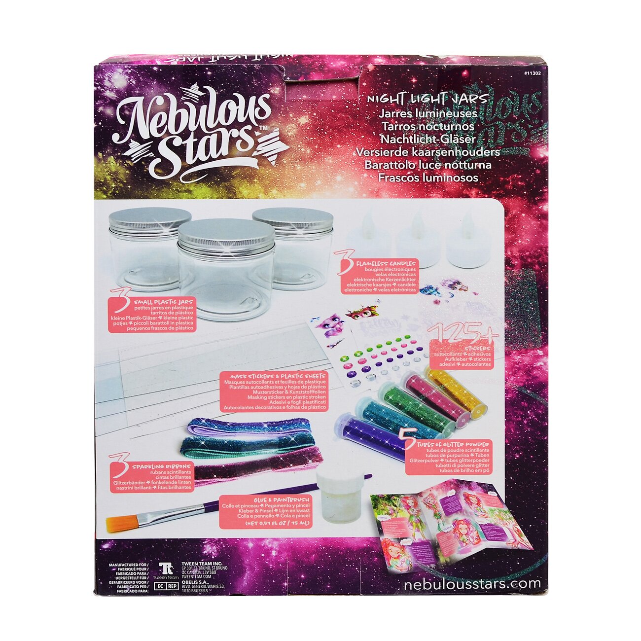 Казкові зірки осяють вночі твої мрії магічним сяйвом! Зроби свою кімнату блискучою, як зоряне небо, за допомогою космічних нічних ліхтариків. У цьому тобі допоможе набір для творчості "Чарівне мерехтіння". Прояви свою фантазію і створи космічні ліхтарики за допомогою 3-х пластикових баночок, прикрась їх блискітками, наклейками, стразами, стрічками і запали свічки без полум'я. Галактика Nebulous Stars — це казковий світ творчості і чарівництва!