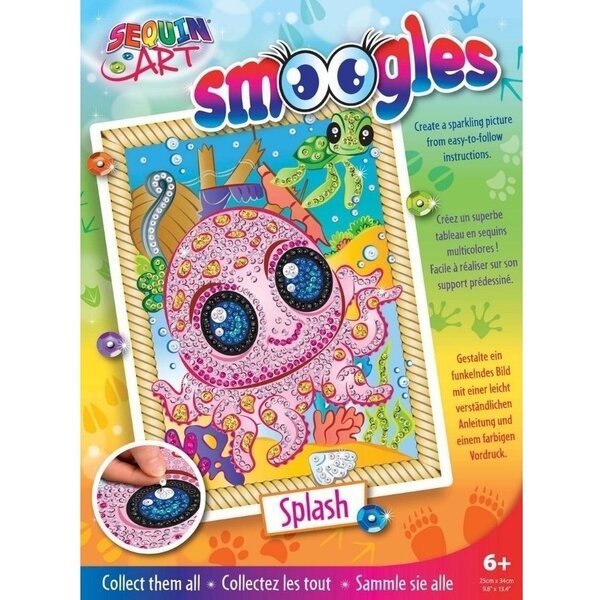 SMOOGLES - нова колекція яскравих картинок з милими тваринами для дітей від 6 років. Яскравий восьминіг з великими очима. Створити дивовижне зображення дуже легко. Потрібно прикріпити за допомогою шпильок кольорові блискітки до зображення-трафарету і пенопластової форми.