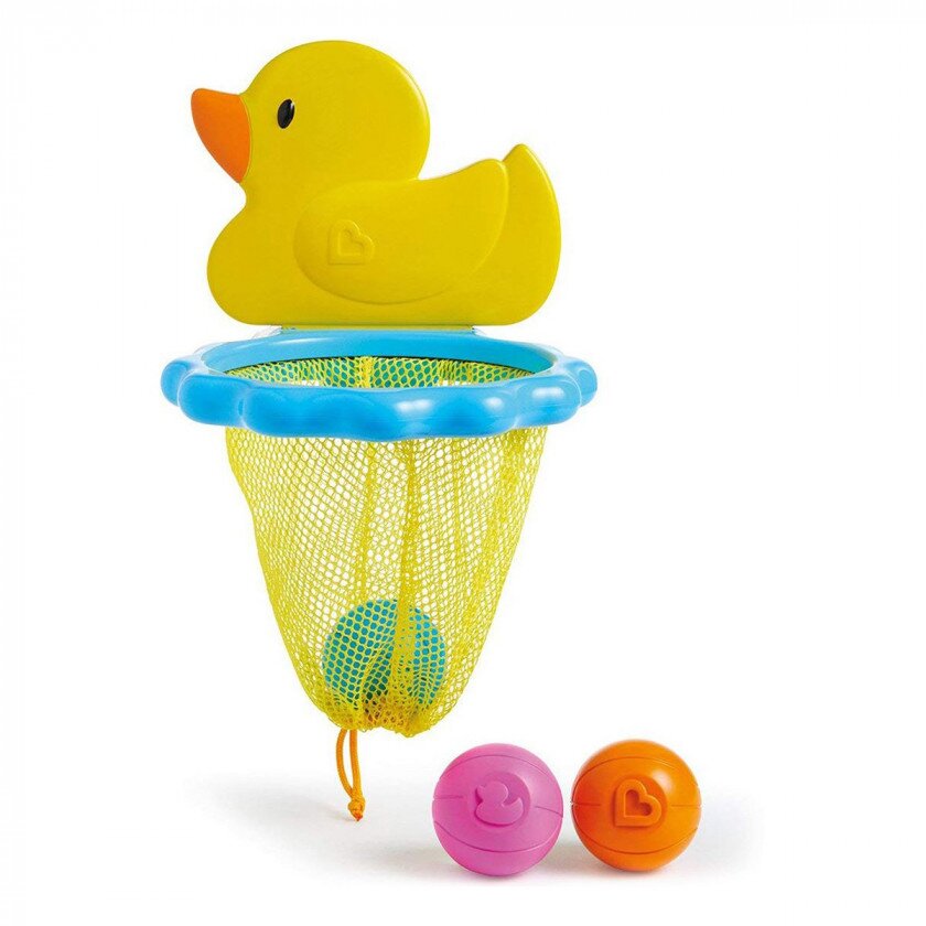 Ігри завжди роблять час купання веселіше! Так чому б не запросити веселого каченя скласти компанію малюкові? Набір для ванни Munchkin Duck Dunk - це ігровий розвиток тактильних навичок і дрібної моторики під час прийняття ванни. Можна "просівати" воду, грати в м'яч, водне поло або повертати "яйця" в гніздо. З обручем з сіткою, які разом представляють собою баскетбольну корзину, а також трьома яскравими м'ячиками ваша дитина знайде тисячу способів розважити себе під час купання.