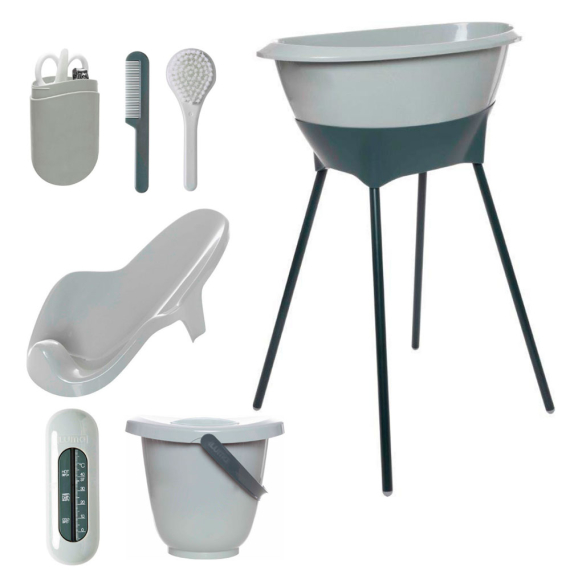 В комплекті: дитяча ванна, підставка для ванни, відро для підгузків, вставка для ванни, манікюрний набір, гребінець, щітка, термометр для ванни та зливна трубка.