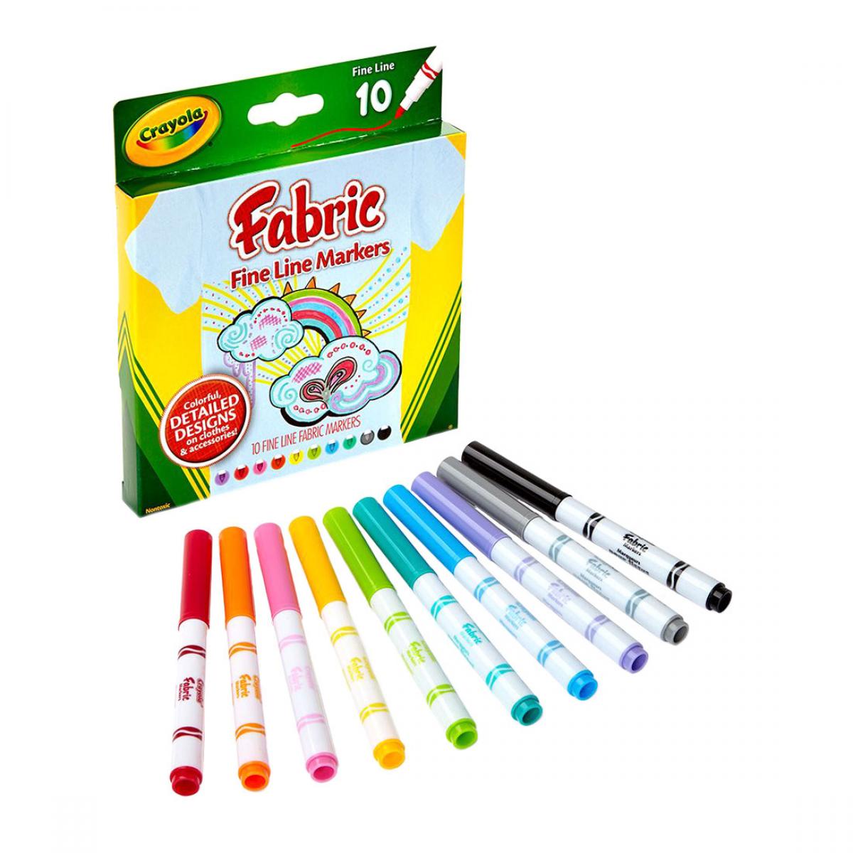 Фломастери Crayola для малювання по тканині пишуть яскравими насиченими квітами, зручно лягають у дитячу ручку, що дозволяє тримати їх правильно, набуваючи перших навичок письма. Набір складається з 10 яскравих фломастерів для малювання на тканинах з бавовни та поліестеру білого чи світлого кольору. Стрижні не вдавлюються при натисканні, причому ними можна малювати і вузьку, і широку лінії. Батьки можуть не хвилюватися, якщо малюк захоче щось спробувати на смак.