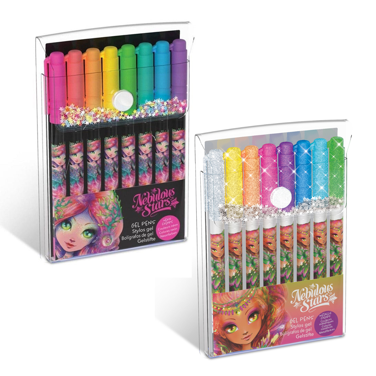 Набір гелевих ручок NEBULOUS STARS – КОСМІЧНІ КОЛЬОРИ чудово підходить для юних, стильних художниць. Пишіть, малюйте, фарбуйте космічними ручками металевих або неонових кольорів.