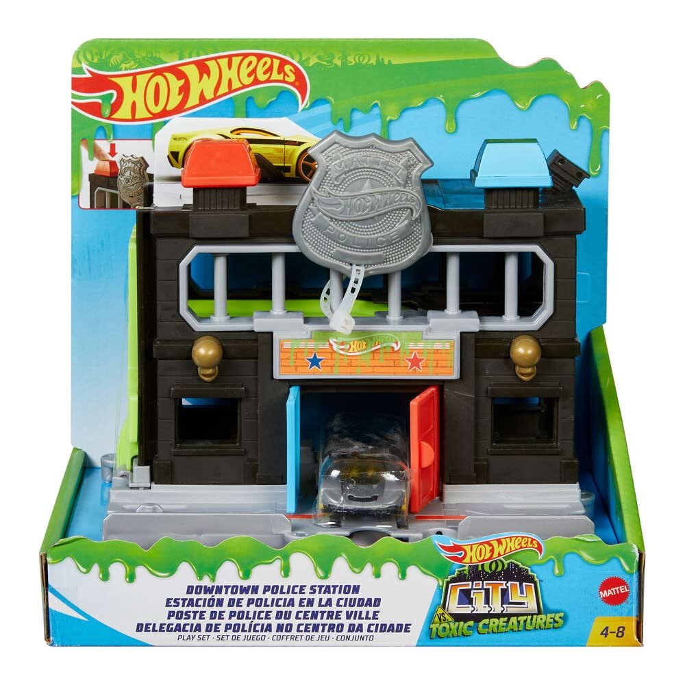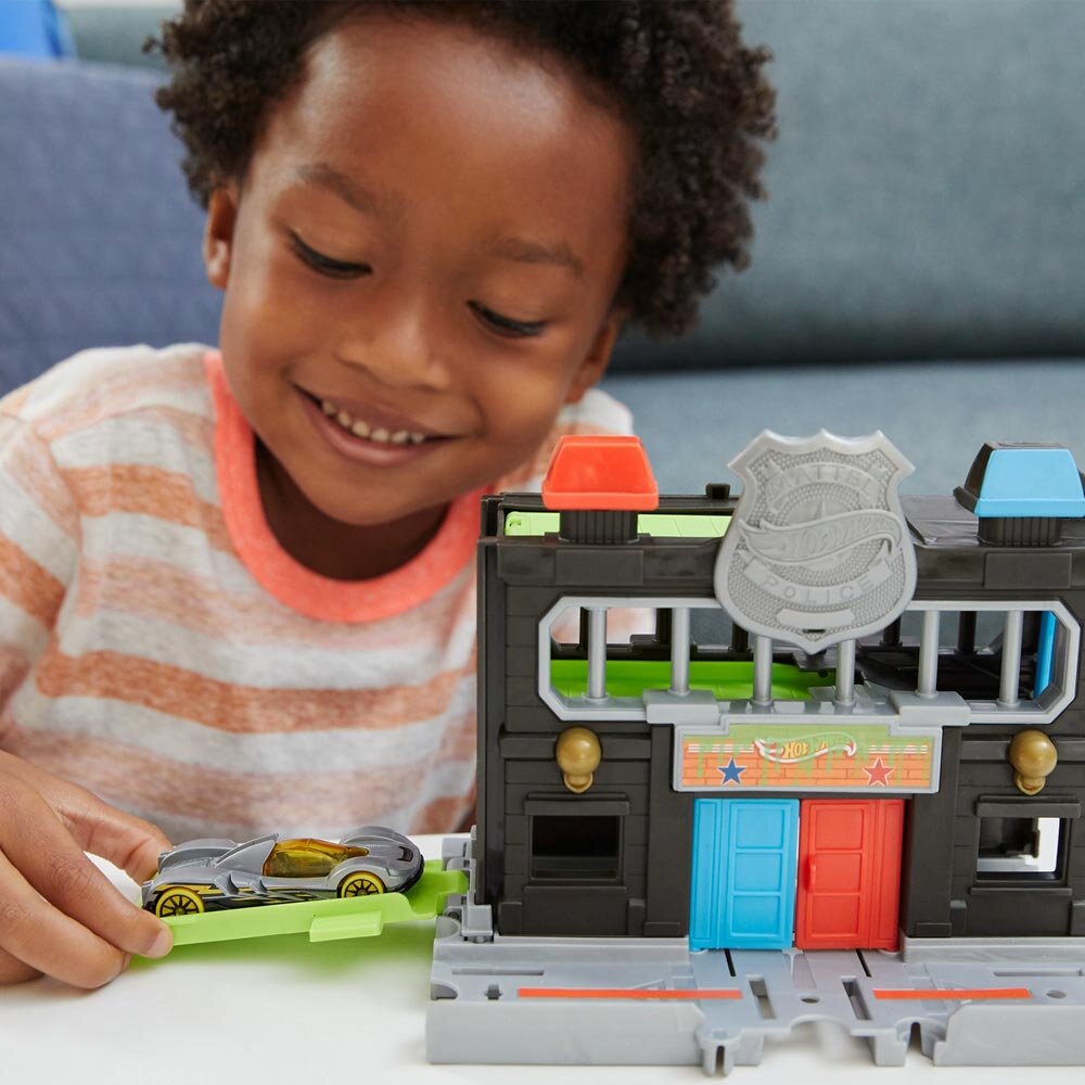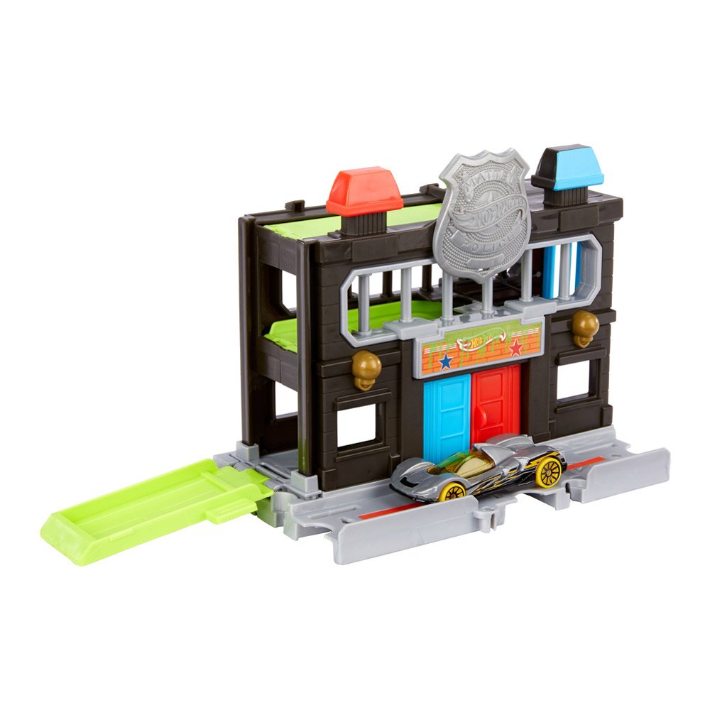 Набір Hot Wheels City Втеча з поліцейського відділку сподобається маленькому поціновувачу екстриму. Підійде для дітей, які обожнюють перегони та незвичні трюки. Для звільнення авто з поліцейського відділку натисніть на червону кнопку на даху. Ви можете використовувати відділок як гараж для своїх машинок Hot Wheels.