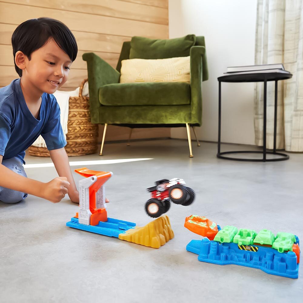Набір Hot Wheels Monster trucks Монстро-стрибок сподобається маленькому поціновувачу екстриму. Підійде для дітей, які обожнюють перегони та незвичні трюки. Встановіть машинку на пусковий механізм і запускайте політ. Завдання — перелетіти через перешкоду.