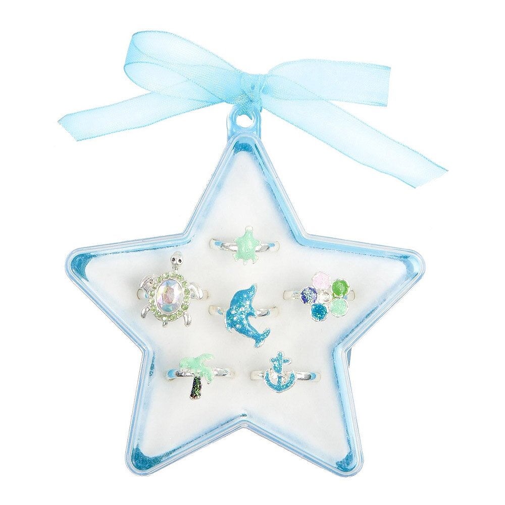 У наборі:5 каблучок на морську тематику; коробочка зі стрічкою у формі зірочки.