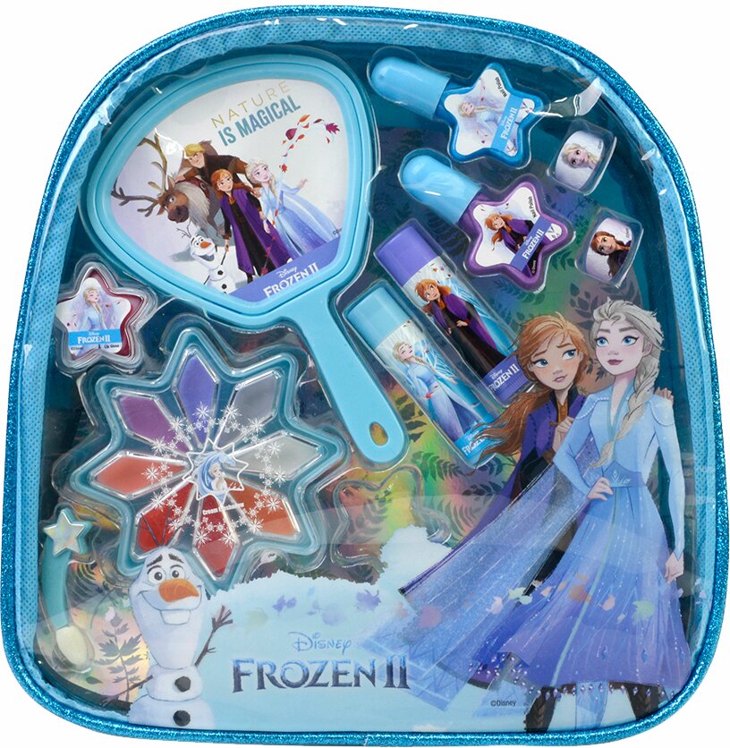 У наборі: 8 крем-тіней, 2 блиски для губ, 2 бальзами для губ, 2 лаки для нігтів, 2 кільця, 1 аплікатор, 1 дзеркало, сумочка. Розмір: 28 х 27 х 8 см.