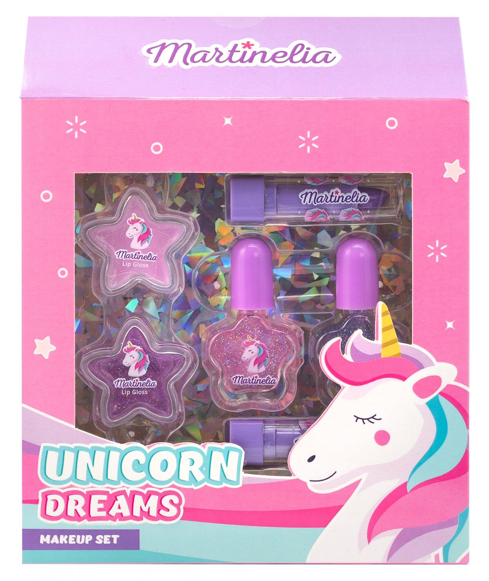 Неймовірний набір Martinelia Unicorn Dreams приведе в захват будь-яку дівчинку, адже в ньому є все необхідне і найулюбленіше: 2 помади для губ (з рожевим і фіолетовим відтінками), 2 блиску для губ з блискітками (з рожевим і фіолетовим відтінками), а також 2 лаку для нігтів (ніжно-рожевого та фіолетового відтінків).