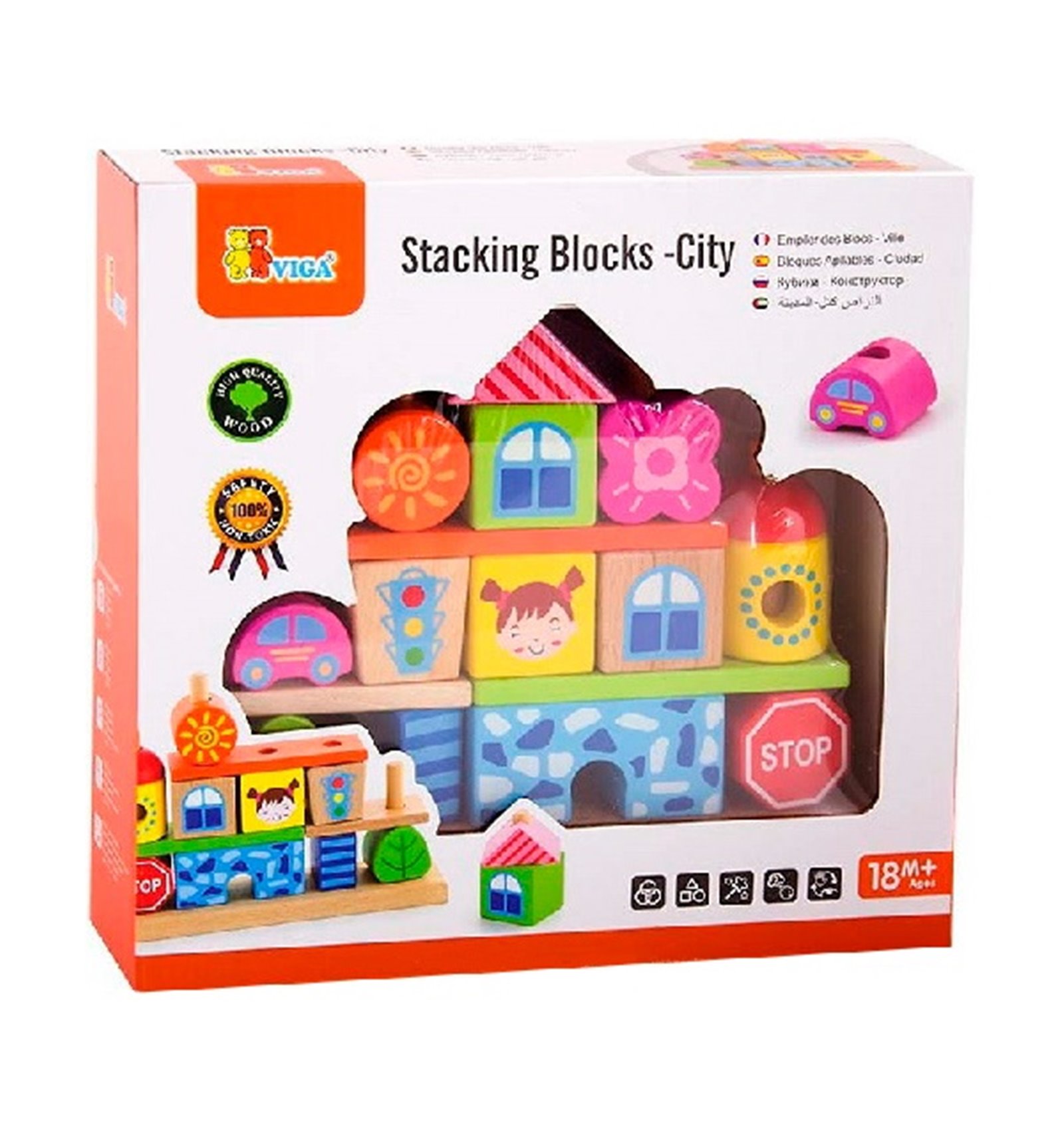 Набір кубиків Місто Viga Toys 50043 - це казкове містечко побудоване з яскравих різнокольорових блоків з якісної деревини, а малюк - головний його архітектор.