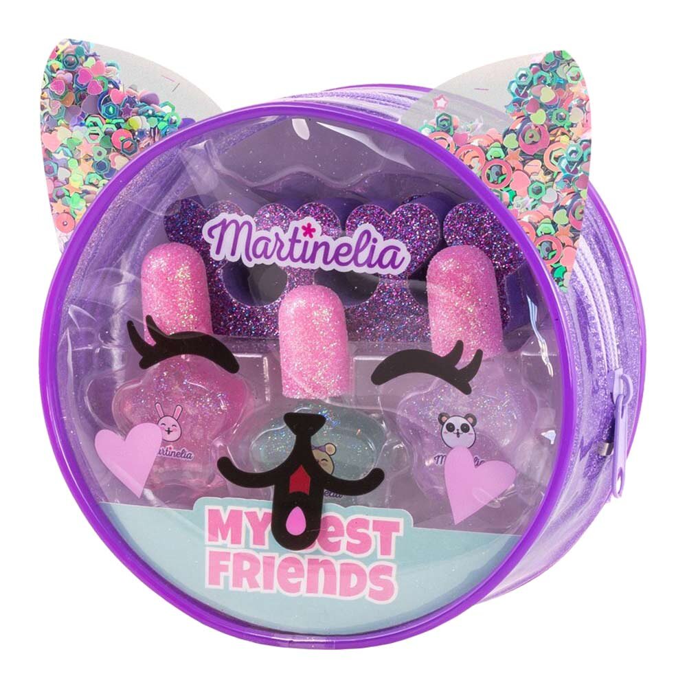 Набір косметики Martinelia Мої найкращі друзі представлений у силіконовій косметичці з вушками, заповненими різнокольоровими пайетками.