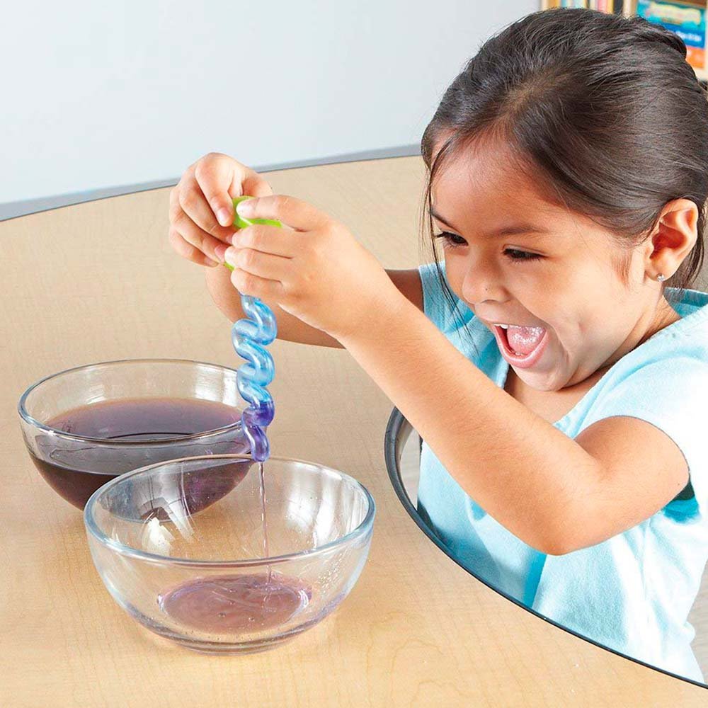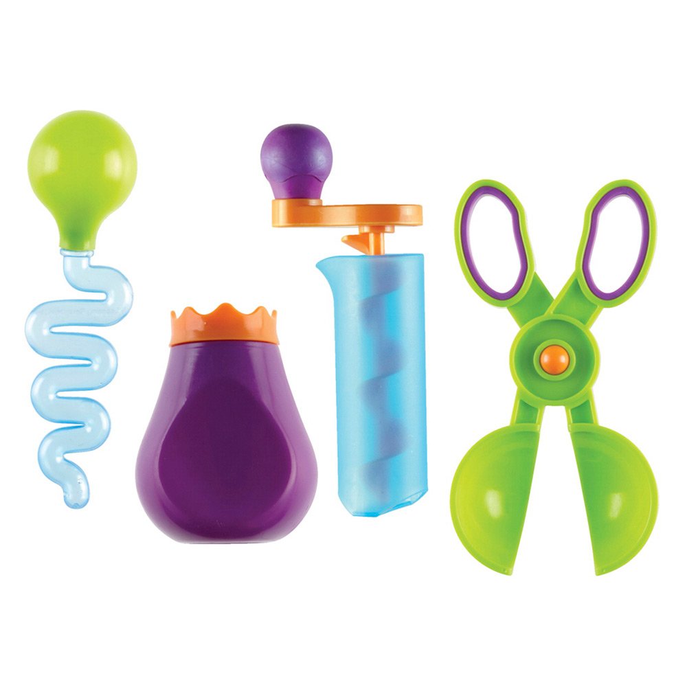 Із цим набором дитина зможе весело проводити час біля води і піску. Наприклад, за допомогою звивистої піпетки він зможе набирати воду в пирскавку і веселитися. Дитина зможе не тільки весело проводити час, а й проводити справжні дослідження. Для цього в наборі йдуть 4 повністю безпечних для здоров'я інструменту: гвинт; звивиста піпетка; бризкалка; ножиці-ложка.