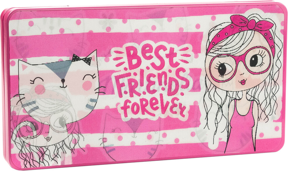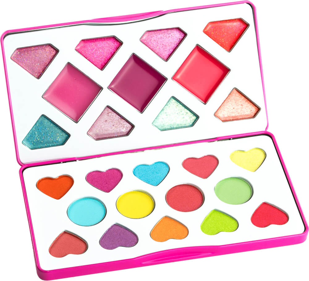 Набір тіней і блисків створений у зручному форматі: палетці у формі пенала. На кришці красуються кошенята і стильне малятко. Такий футляр можна носити із собою в сумці, вирушаючи в гості до подружки. За допомогою палітри дівчата навчаться створювати дитячий макіяж та святковий образ. Набір стане в нагоді для святкування дня народження, ранків і театральних виступів.