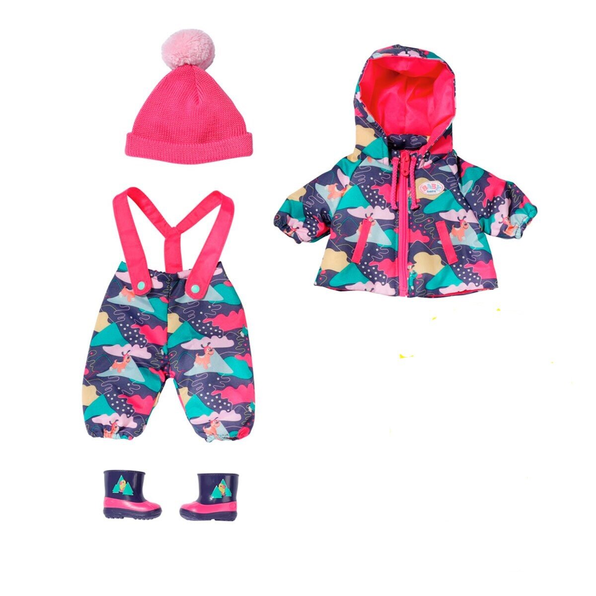 Набір одягу для ляльки BABY BORN серії Deluxe СНІЖНА ЗИМА створений для яскравих і активних прогулянок. В комплекті тепла куртка з капюшоном і яскравим принтом, і штани на підтяжках. Зручно та дуже гарно! Рожева в'язана шапочка з неймовірним пухнастим помпоном. Спеціальні чобітки-снігоступи, що не промокають і не ковзають. Все для зручності Вашого малюка.