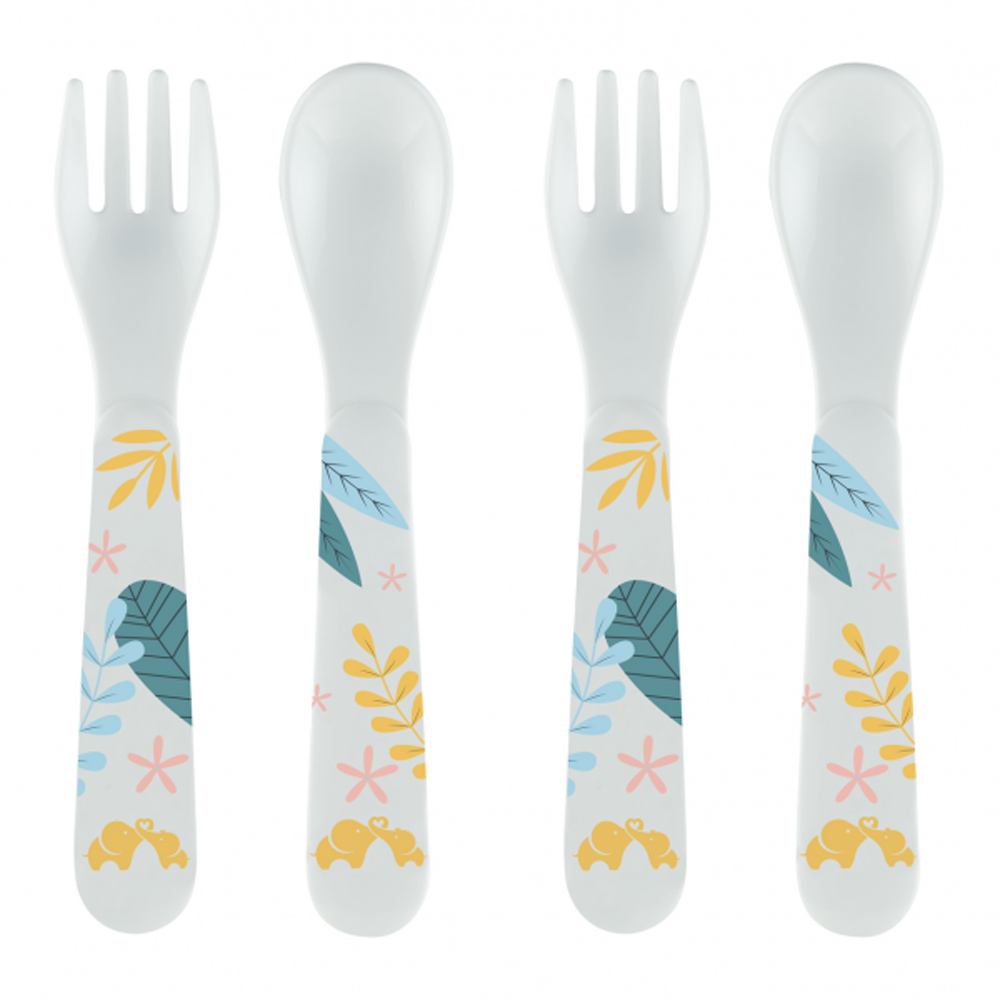 Набір з двох ложок і двох виделок, виготовлений з високоякісного пластику з красивим принтом, ідеально підходить для перших спроб малюка у самостійному годуванні.