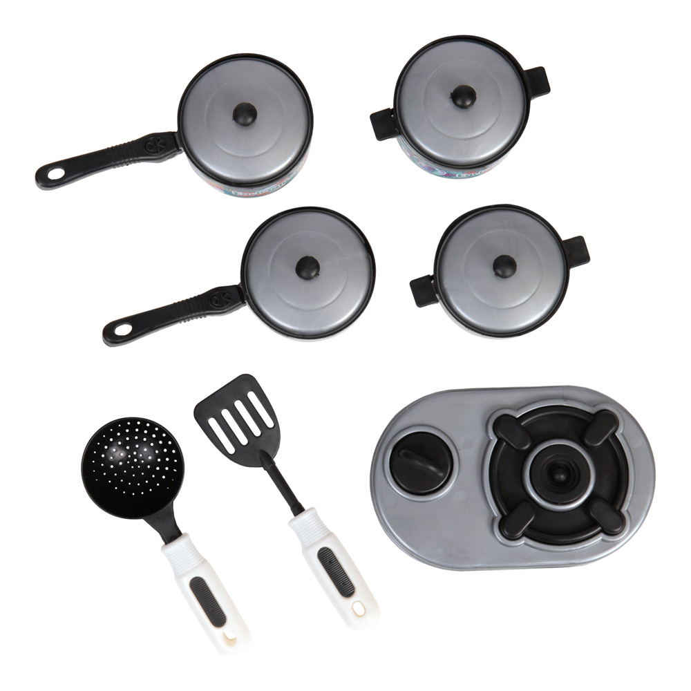 Комплектація: Плита, Низька сковорода з кришкою (13.5 х 6.5 х 3 см), Висока сковорода з кришкою (13.5 х 6.5 х 4 см), Низька каструля з кришкою (6.5 х 6.5 х 3), Висока каструля з кришкою (6.5 х 6.5 х 4 см), Шумівка (13 х 3.5 х 1 см), Лопатка (13 х 3.5 х 1 см).