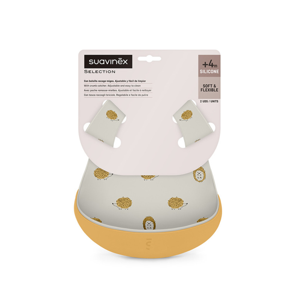 Набір силіконових нагрудників Suavinex Colour Essence - виготовлений повністю з м'якого силікону, легко чиститься, оснащений застібкою, що регулюється, і кишенею для крихт. Підходить для дітей віком від 4 місяців.
