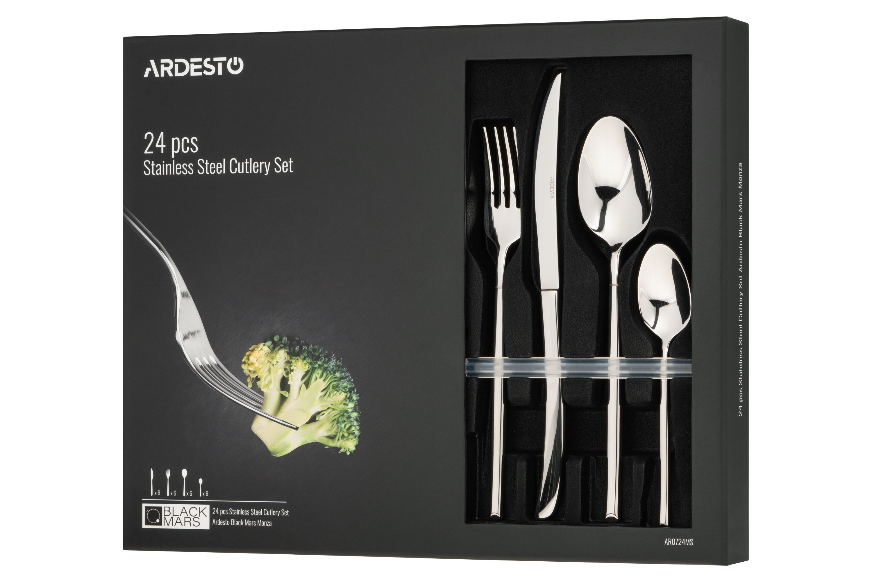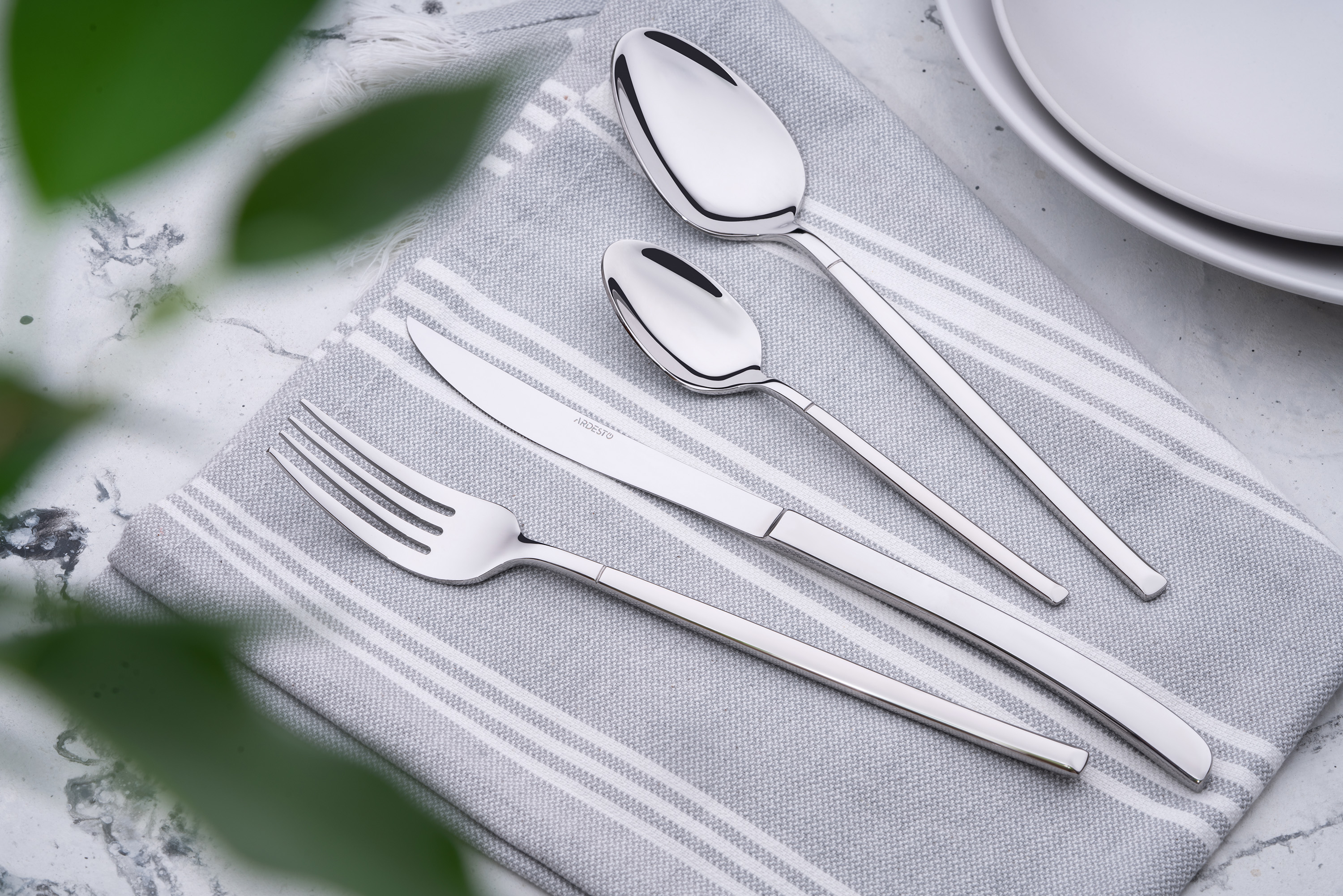 Набір столового приладдя з 24 предметів. Включає в себе: ложки, виделки і ножі. Приладдя виконано з нержавіючої сталі з дзеркальною поліровкою.