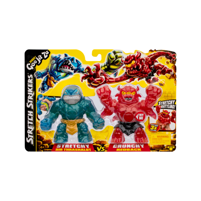 Набір стретч-антистрес Goo Jit Zu Stretch strikers Траш та Редбек містить дві стретч іграшки. Приготуйтеся до тотальної битви, коли улюблений герой Траш буде битися зі злим лиходієм Редбек. Кожен воїн має здатність розтягуватися до 3-х разів. Кожна іграшка має унікальне наповнення. Стискайте та розтягуйте їхні тіла, щоб відкрити його.