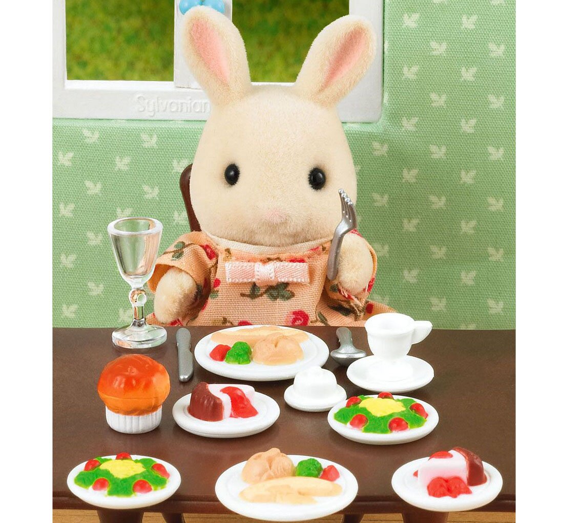 • Великий набір аксесуарів для обіду Sylvanian Families Серія "Інтер'єр та затишок". У комплекті є все те, що знадобиться для щільного обіду: плетений кошик з хлібом, тарілочки з закусками і десертом, кекси. Столових приладів велика кількість: вилки, ложки, ножі, келихи і чашечки для кави, сільниця, перечниця, глечик.