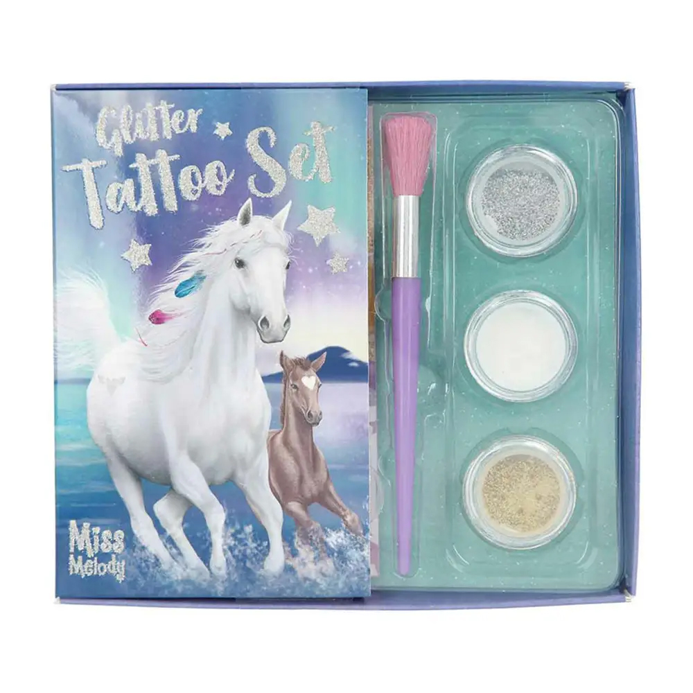 Коні, підкови, сердечка, зірки і багато іншого: набір блискучих татуювань Miss Melody включає 45 симпатичних наклейок, 3 блискітки (золотий, срібний, білий) і м'яку кисть. Для красивого блиску на шкірі!