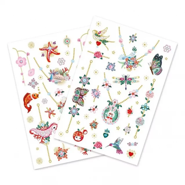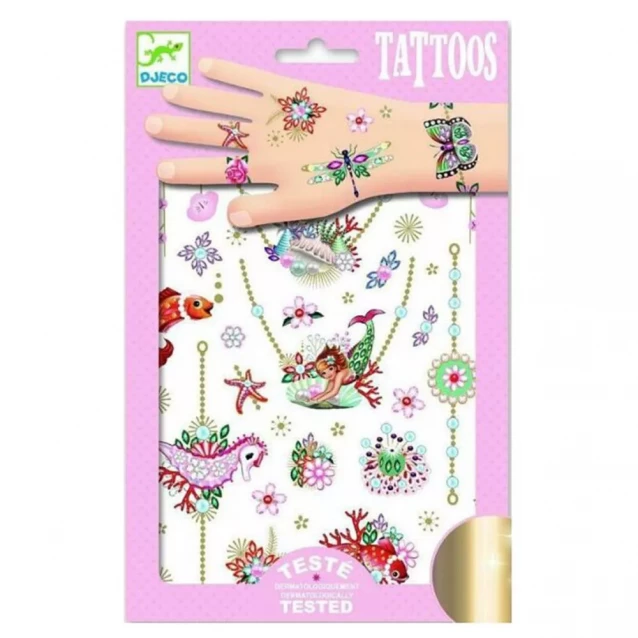 Кожен аксесуар прикрашений яскравими намистинами, квіточками. Фішкою є ніжні морські образи: русалки, рибки і черепашки. Дитячі татуювання для дівчаток можна використовувати для свята або звичайної гри з подругами. Вони легко кріпляться до шкірі і зовсім не заважають. Батьки можуть бути впевнені в якості та безпеки татуювань від французького бренду DJECO. Набори протестовані дерматологами.